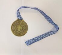 O disco metálico possui uma alça de suspensão integrada ao topo (tipo orelha), por onde transpassa uma fita de tecido sintético com padronagem geométrica em meandro (grega) em azul sobre fundo branco, cores nacionais da Grécia, finalizada em costura reta na extremidade oposta.