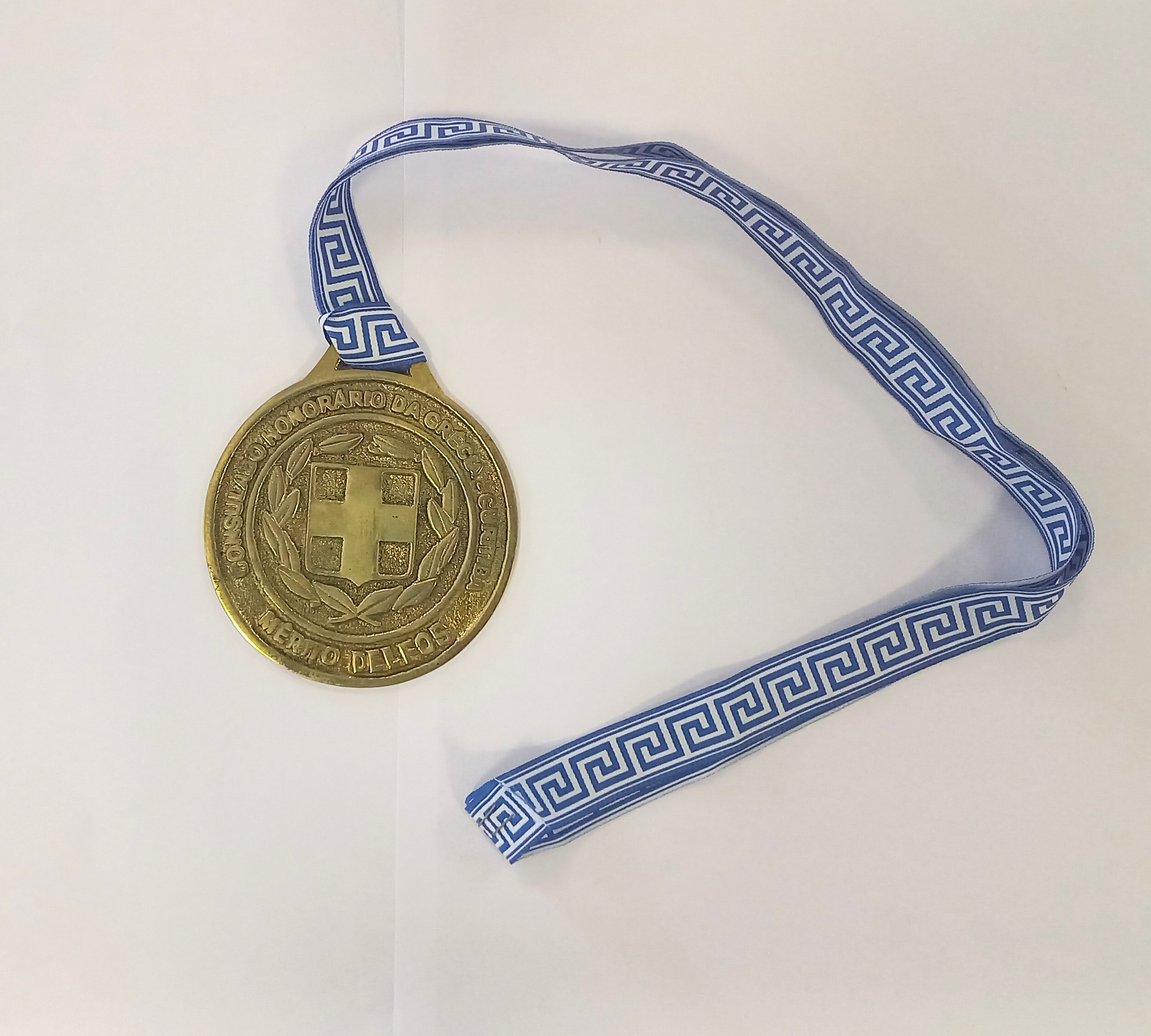 Acervo Tridimensional, Insígnia, Medalha, Honorificência, Consulado Honorário da Grécia, Curitiba, Mérito Delfos, República Helênica, Liga Metálica, Douramento, Têxtil, Fita de Pescoço, Padrão de Meandro, Heráldica, Cultura Material, Objeto Comemorativo, Relações Internacionais, Simbologia Grega, Coroa de Louros, Instituição de Memória, Diplomacia, Patrimônio Cultural, Objeto de Distinção, Identidade Nacional