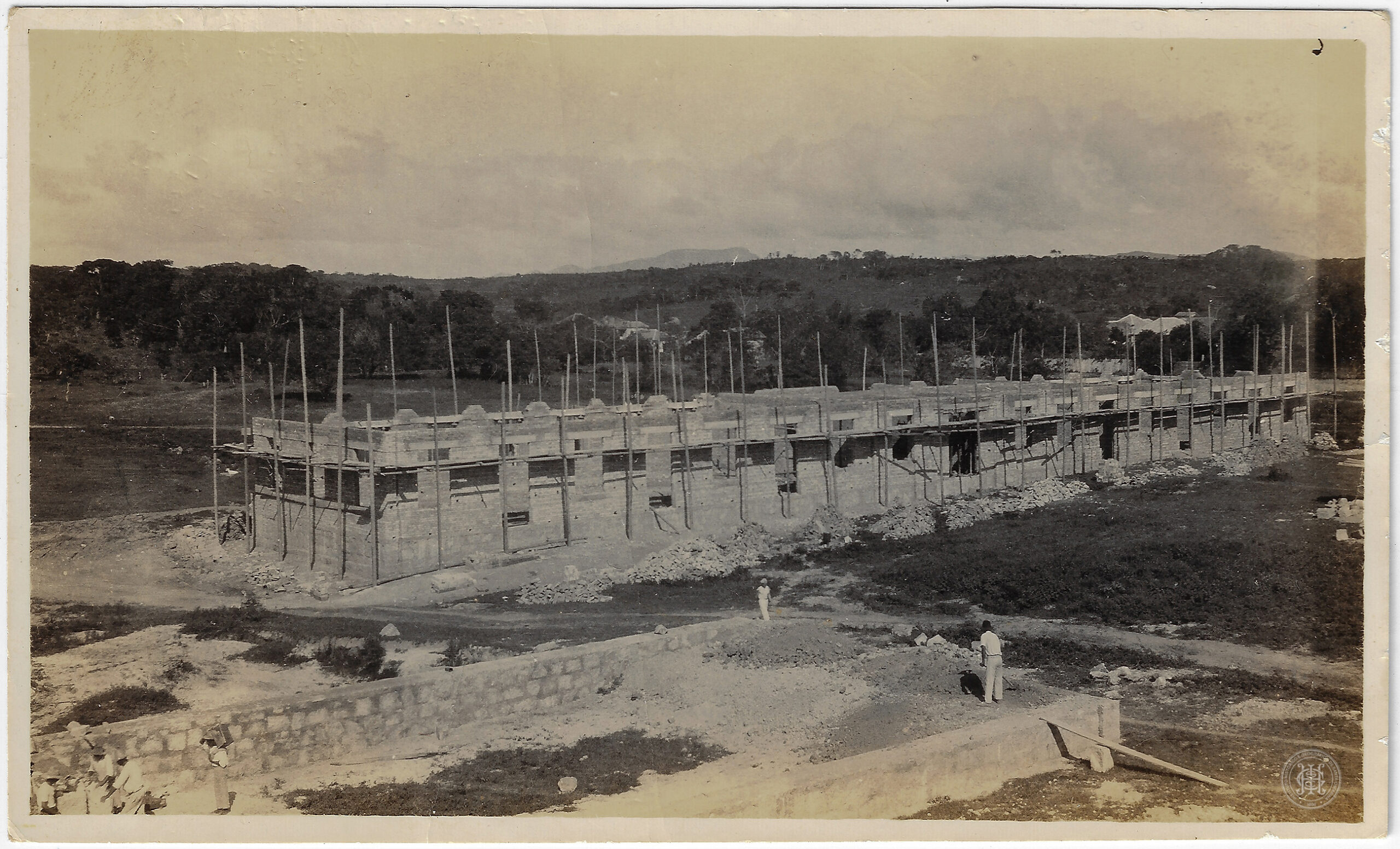 Esta fotografia registra a construção do 14° Batalhão de Caçadores na cidade de Florianópolis, Santa Catarina, no ano de 1940. A imagem apresenta, em plano médio, a estrutura de uma edificação de grandes proporções em estágio intermediário de alvenaria, caracterizada por uma planta retangular alongada. A construção exibe diversas aberturas para janelas e portas distribuídas simetricamente, com andaimes de madeira e estacas verticais posicionados ao longo de toda a sua extensão. À frente do prédio, observam-se montes de terra, pedregulhos e materiais de construção espalhados pelo terreno irregular.
