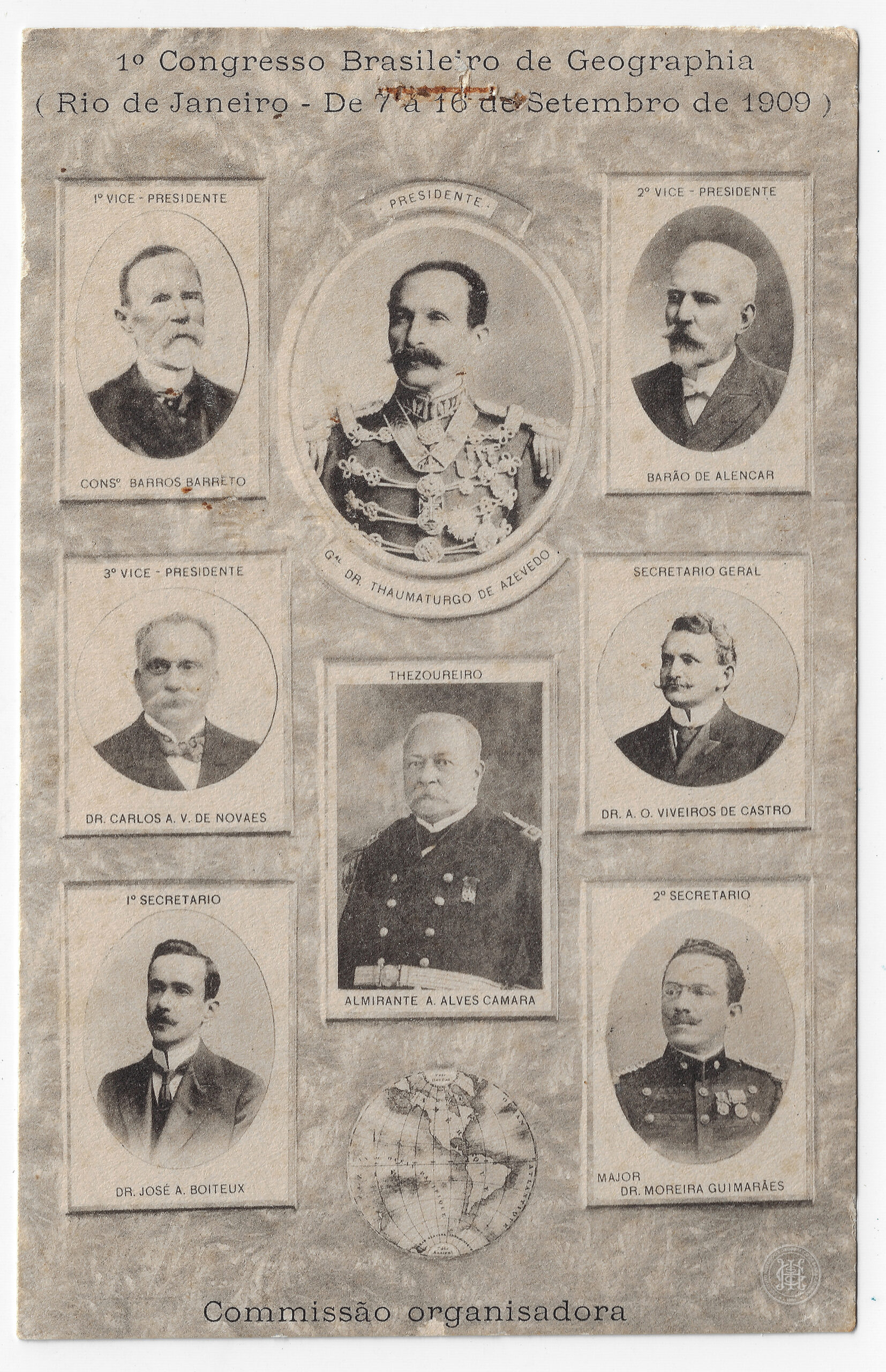 Frente: 1º Congresso Brasileiro de Geographia ( Rio de Janeiro - De 7 a 16 de Setembro de 1909 ); 1º VICE - PRESIDENTE CONSº BARROS BARRETO; PRESIDENTE GAL DR. THAUMATURGO DE AZEVEDO; 2º VICE - PRESIDENTE BARÃO DE ALENCAR; 3º VICE - PRESIDENTE DR. CARLOS A. V. DE NOVAES; THEZOUREIRO ALMIRANTE A. ALVES CAMARA; SECRETARIO GERAL DR. A. O. VIVEIROS DE CASTRO; 1º SECRETARIO DR. JOSÉ A. BOITEUX; 2º SECRETARIO MAJOR DR. MOREIRA GUIMARÃES; Commissão organisadora.