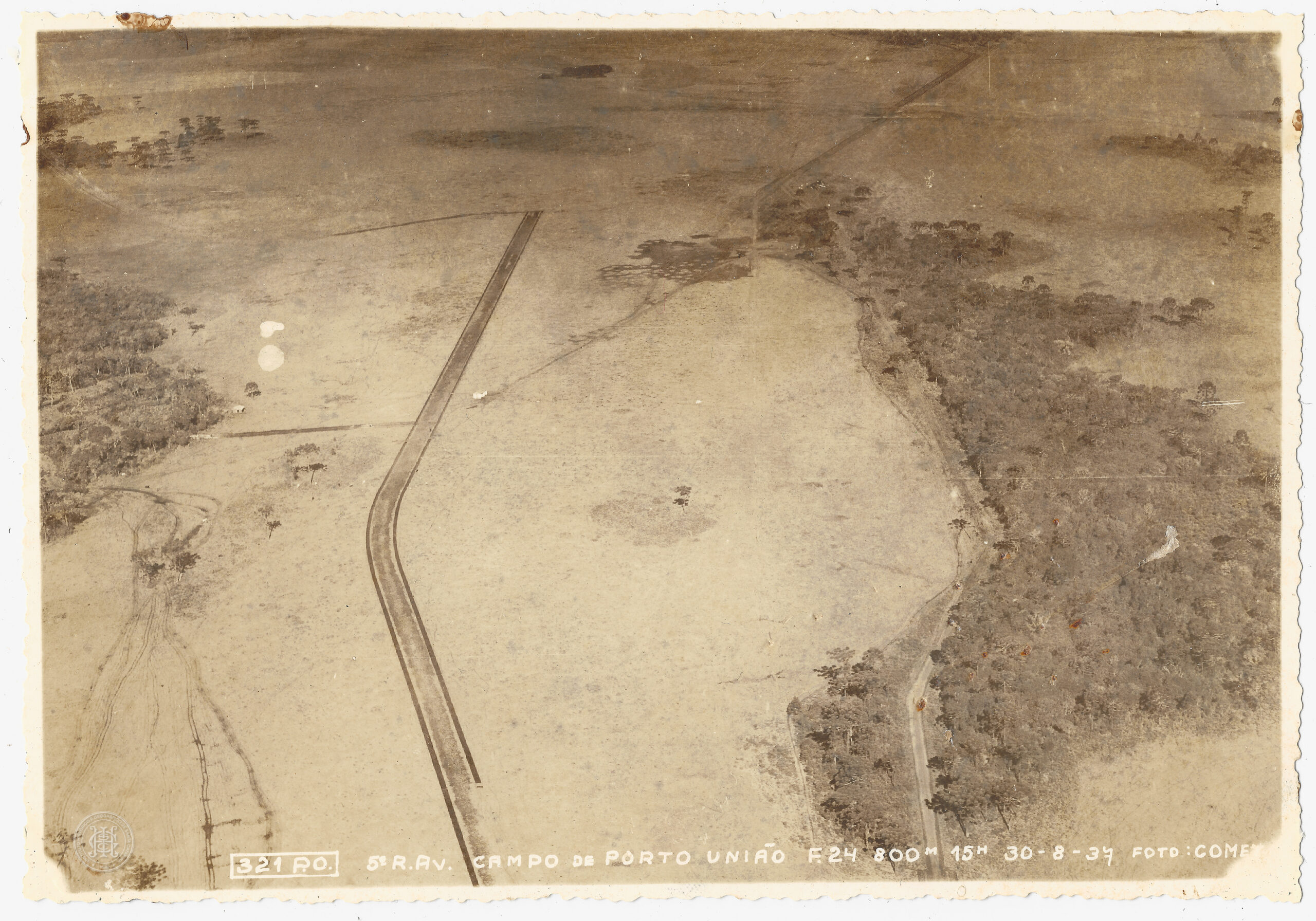 Fotografia Aérea, Vista Aérea Oblíqua, Campo de Aviação, Aeródromo, Pista de Pouso, Porto União, Santa Catarina, 5ª Região de Aviação, Aviação Militar, Infraestrutura, Aeronáutica, Paisagem, Vegetação, Mata Nativa, Araucária, Pinheiro-do-Paraná, Campo, História da Aviação, Foto Comet