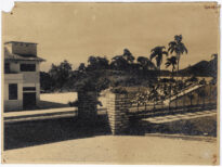 No primeiro plano, à esquerda, observa-se uma área pavimentada em tom claro, interceptada por dois pilares verticais construídos em tijolos aparentes dispostos de forma regular. À esquerda, destaca-se a fachada lateral de um edifício de dois pavimentos com telhado aparente, apresentando aberturas retangulares e linhas arquitetônicas retas.