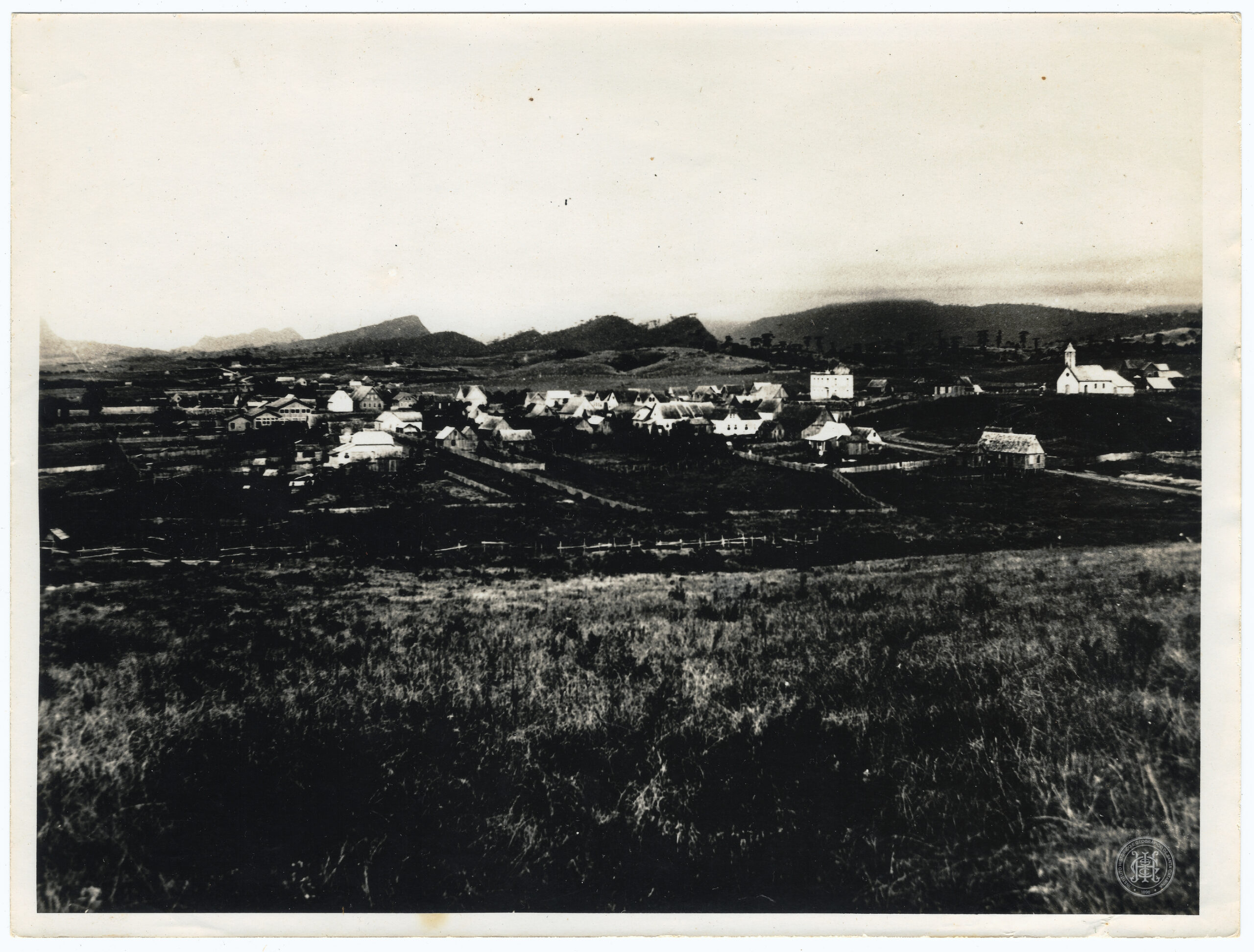 A composição é estruturada em três planos principais: o primeiro plano é composto por uma área de vegetação rasteira e densa em declive; o plano médio apresenta a ocupação urbana, caracterizada por diversas edificações de pequeno porte com telhados de duas águas, dispostas ao longo de vias e terrenos delimitados por cercas lineares. À direita, destaca-se uma edificação religiosa com torre sineira simplificada e telhado em ângulo acentuado, situada em uma pequena elevação.