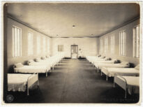 A composição apresenta uma perspectiva central profunda, com um corredor central ladeado por duas fileiras de camas metálicas brancas, organizadas simetricamente.