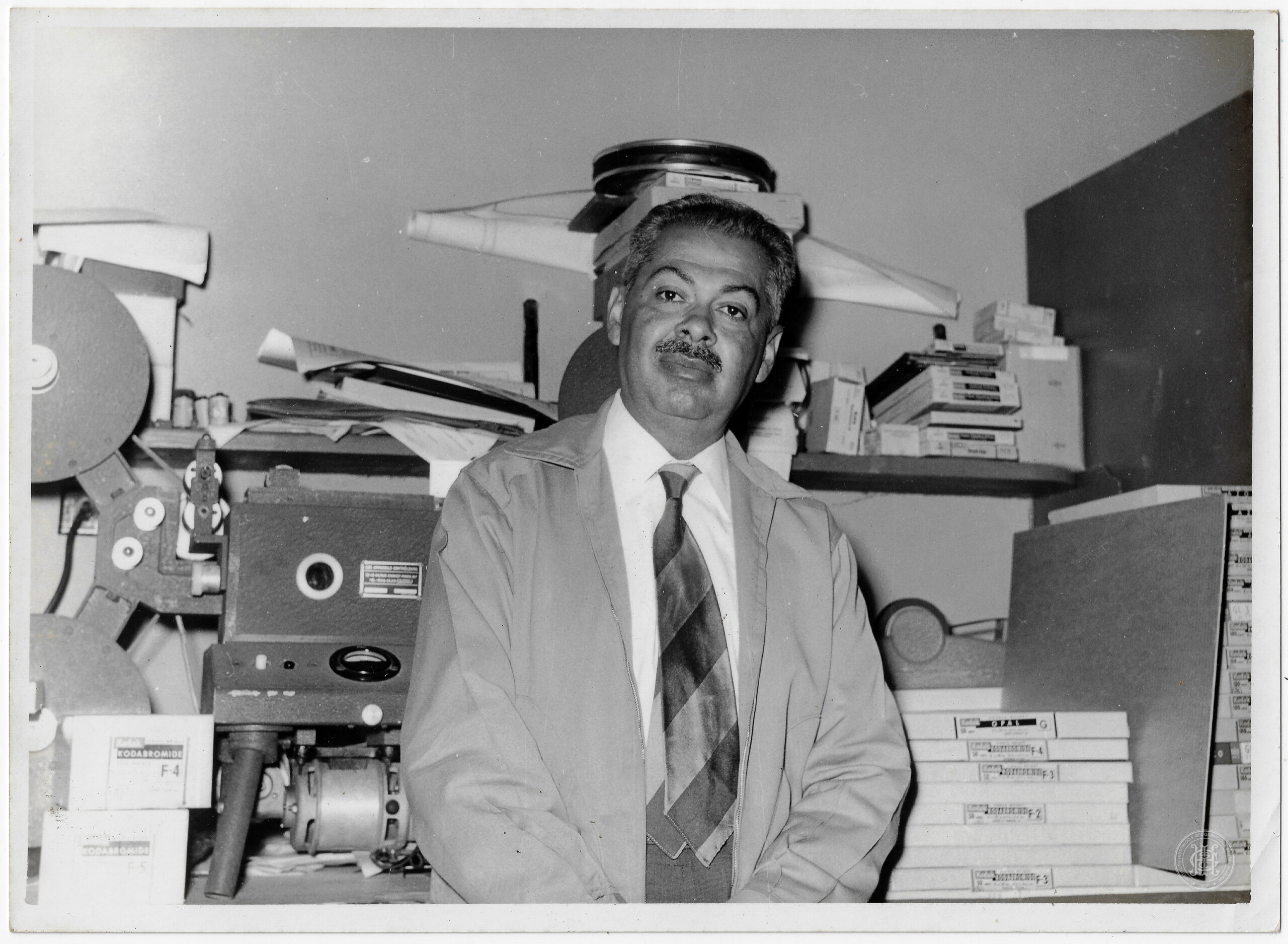 Esta fotografia registra um homem no interior de um laboratório em Pátzcuaro, México. O sujeito, um homem de pele morena, cabelos curtos e bigode, está posicionado em plano médio no centro da composição, voltado frontalmente para a câmera. Ele traja uma japona (casaco) de cor clara sobre uma camisa branca e uma gravata com listras diagonais largas e escuras. O ambiente laboratorial é caracterizado pela presença de equipamentos técnicos e insumos fotográficos: à esquerda, observa-se uma rebobinadora de filmes e caixas de papel fotográfico da marca "Kodabromide"; à direita e ao fundo, prateleiras repletas de caixas empilhadas, rolos de filme e papéis.