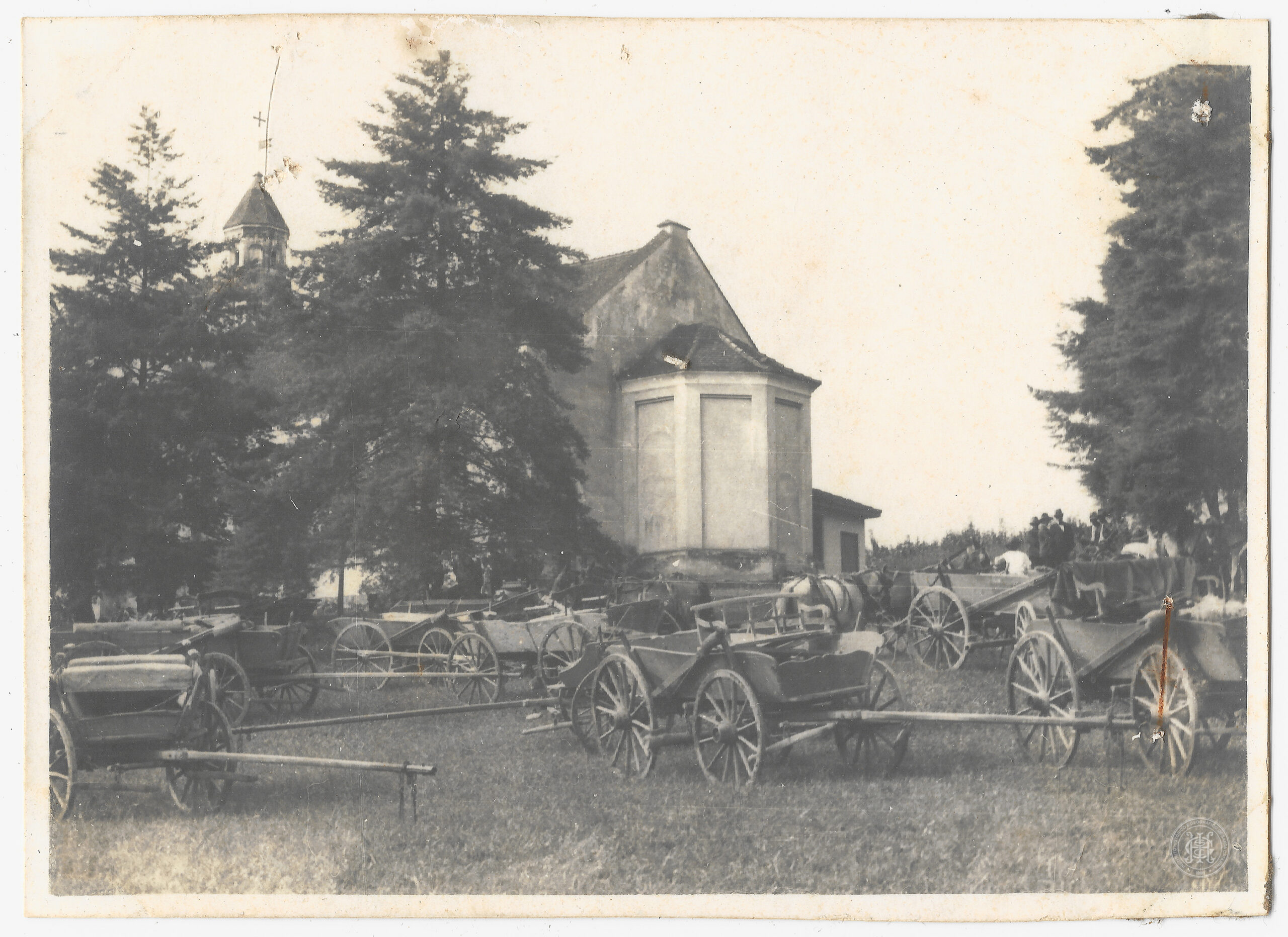 Em primeiro plano e plano médio, diversas carroças de madeira com rodas raiadas estão estacionadas de forma dispersa. Ao fundo, destaca-se a parte posterior da edificação religiosa, evidenciando uma abside poligonal e uma torre sineira com cúpula e cruz no topo, parcialmente encoberta por árvores de grande porte.