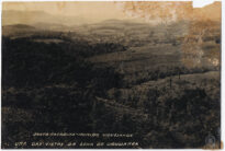 No plano médio, a paisagem abre-se para um vale onde se alternam áreas de pastagem, campos de cultivo e pequenos agrupamentos de árvores, sugerindo uma ocupação agrícola dispersa. Ao fundo, a topografia é marcada por sucessivas cadeias de morros e montanhas que se estendem até a linha do horizonte, sob um céu claro que apresenta manchas de oxidação no canto superior direito do suporte original.