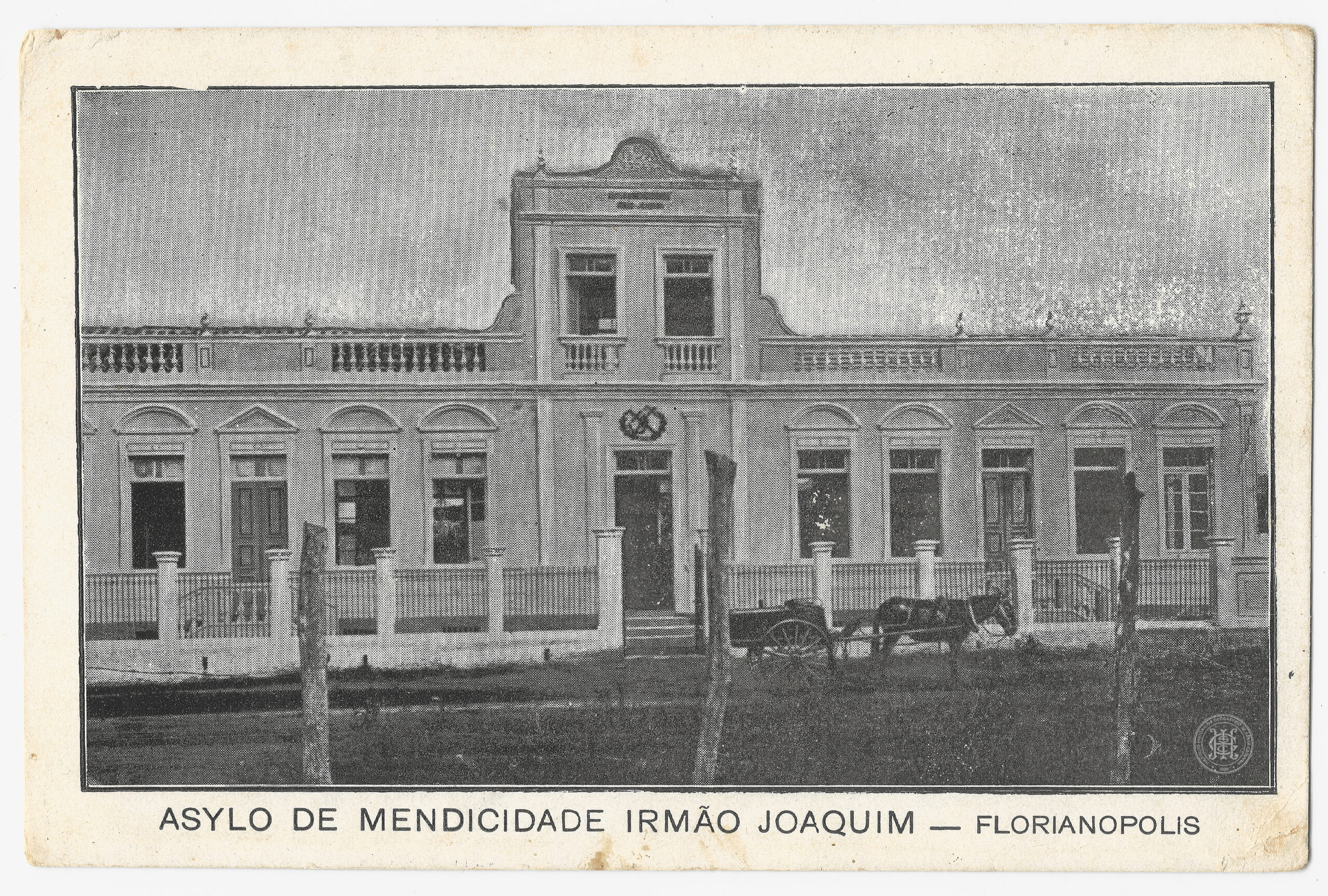 No plano médio, à direita da entrada principal, identifica-se uma carroça de tração animal estagnada, com um cavalo de pelagem escura atrelado ao veículo. O solo em frente à edificação apresenta-se sem pavimentação definitiva, com vegetação rasteira esparsa. A iluminação é natural e frontal, projetando sombras suaves que ressaltam os relevos arquitetônicos, como as molduras das janelas e o platibanda que oculta o telhado. Na margem inferior da imagem, fora da área da fotografia, consta a legenda impressa em caixa alta: "ASYLO DE MENDICIDADE IRMÃO JOAQUIM — FLORIANOPOLIS". O registro integra elementos urbanos e arquitetônicos que contextualizam a assistência social na capital catarinense no início do século XX.