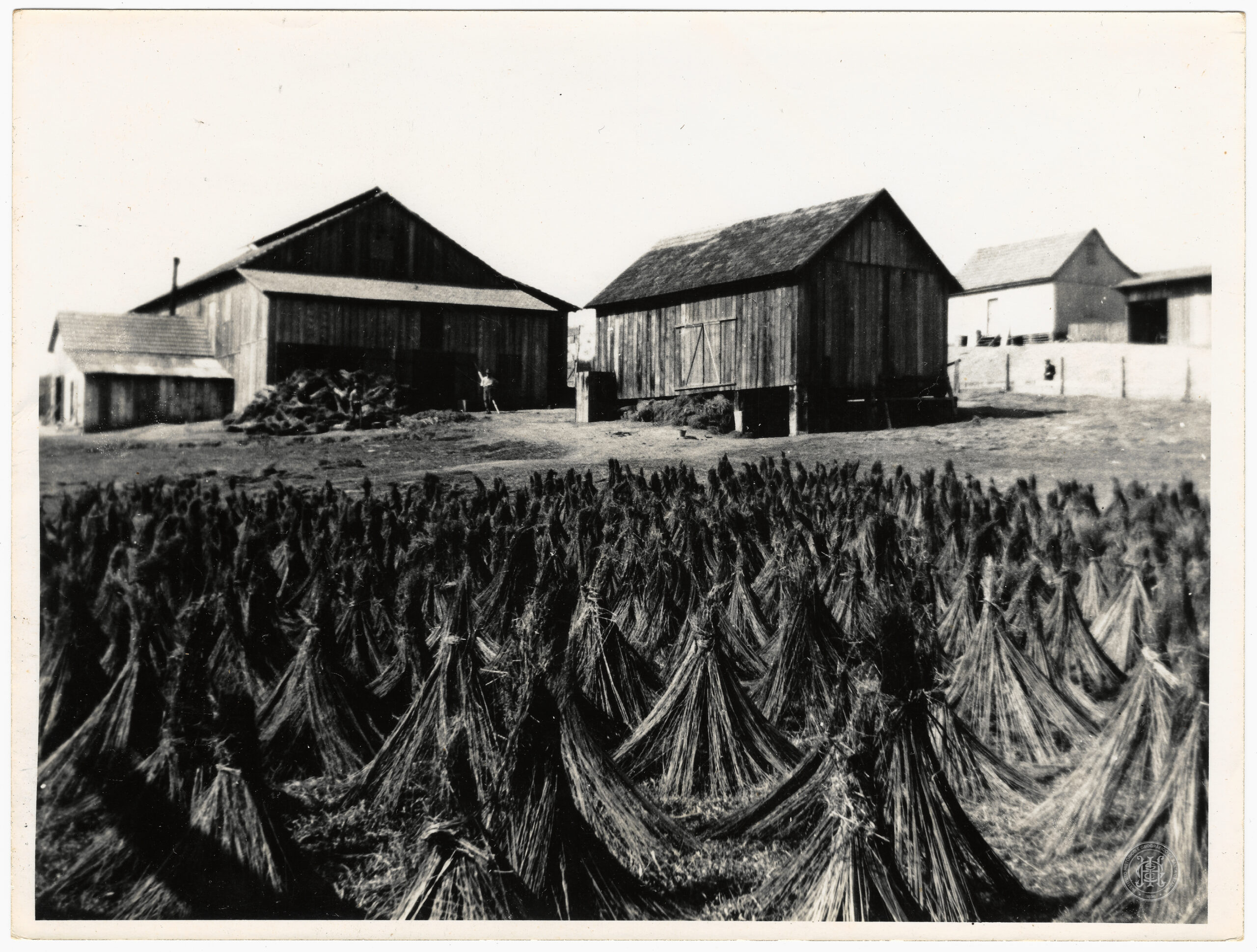 Atividade de secagem de fibras ou cereais em uma propriedade rural em Santa Catarina. A composição é dominada, em primeiro plano, por uma extensa área de solo coberta por inúmeros feixes de material vegetal dispostos verticalmente em formato cônico (feixes ou medas), organizados em fileiras que criam um padrão rítmico e conferem profundidade à cena.