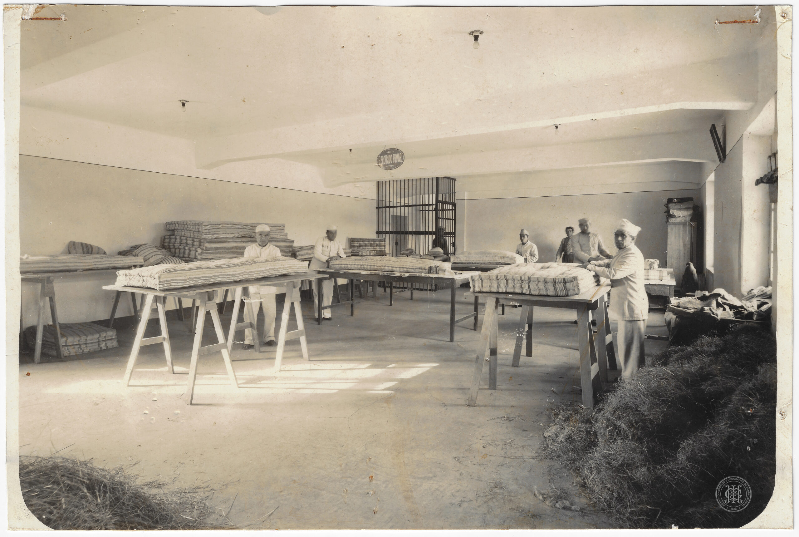 Penitenciária de Florianópolis, sistema prisional, trabalho prisional, oficina, colchoaria, detentos, uniforme, manufatura, mobiliário prisional, arquitetura institucional, década de 1930, crina vegetal, cavaletes, trabalho manual,