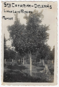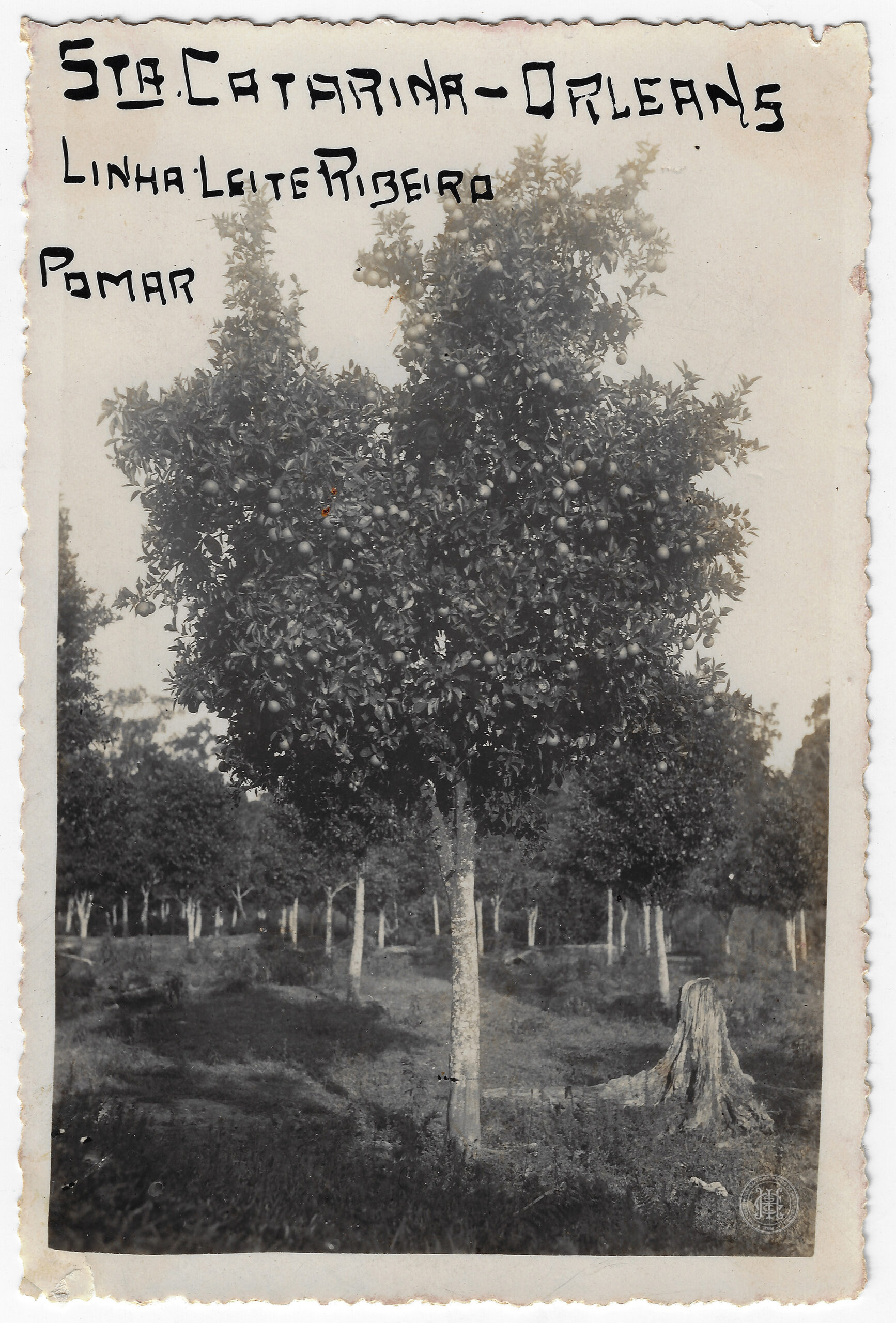 No quadrante superior esquerdo, sobre a área do céu, constam as inscrições manuscritas "STA. CATARINA – ORLEANS / LINHA LEITE RIBEIRO / POMAR" em letras de forma com tinta escura.