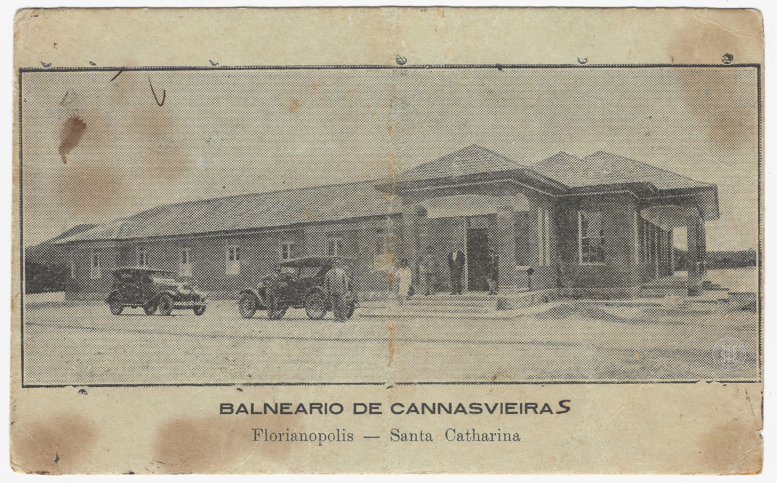 Hotel de Canasvieira no Balneario de Cannasvieiras, em Florianópolis, Santa Catarina, no ano de 1929. A composição apresenta uma edificação de arquitetura civil de pavimentação térrea, com telhado de múltiplas águas e uma varanda lateral sustentada por colunas à direita. No primeiro plano, à esquerda e ao centro, observam-se dois automóveis de época, do tipo calhambeque, estacionados sobre um terreno de solo claro e plano. Um indivíduo encontra-se em pé ao lado do segundo veículo, enquanto um grupo de pessoas, incluindo figuras masculinas em trajes formais, está posicionado na entrada principal do edifício, sob uma pequena cobertura.