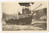 Barco "Seival", associado à figura histórica de Anita Garibaldi, em Laguna, Santa Catarina, no ano de 1945. A composição é dominada, em primeiro plano e plano médio, pela estrutura de madeira de uma embarcação de grande porte disposta sobre calços em terreno arenoso, vista de perfil em ângulo oblíquo.