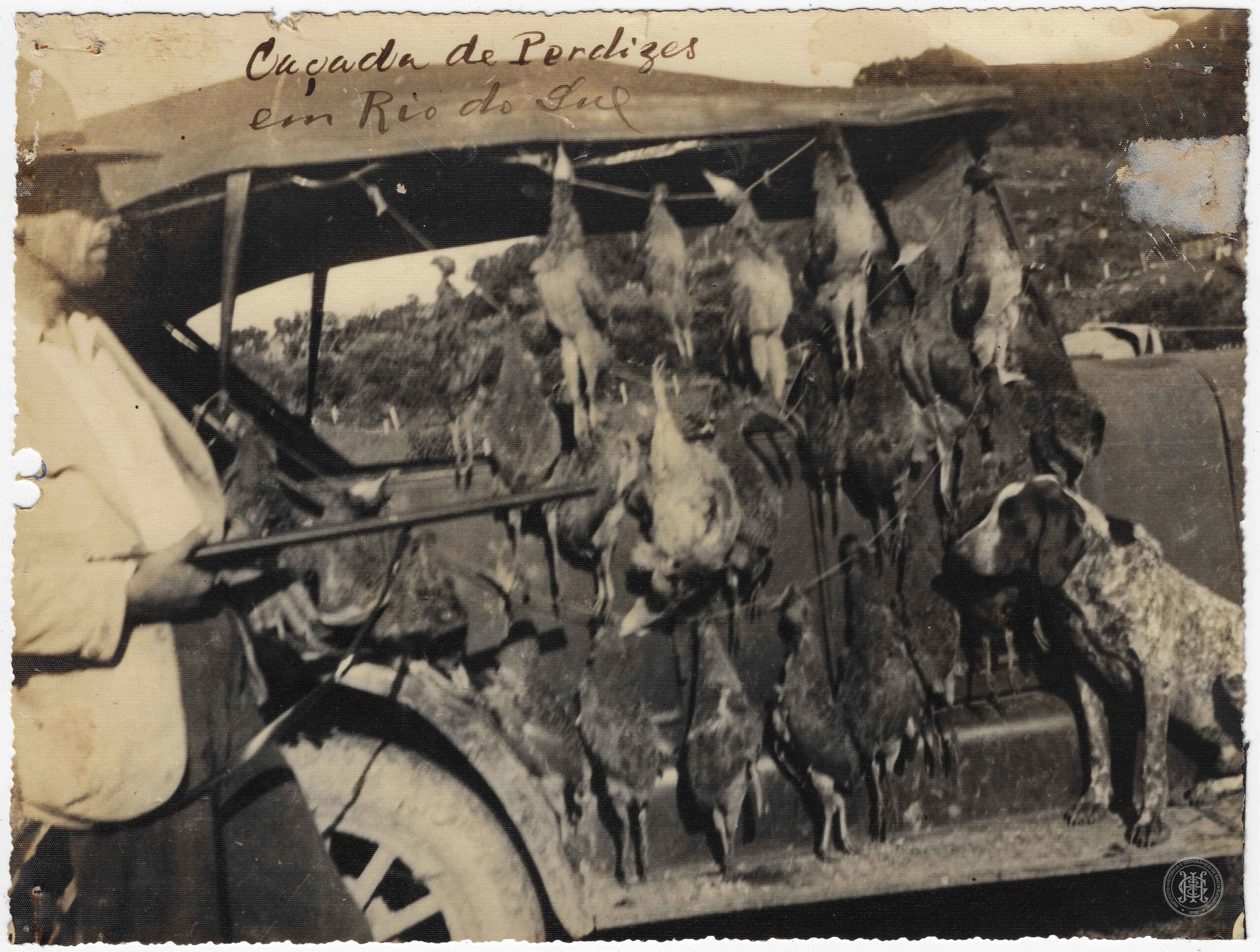 Registra o resultado de uma caçada de perdizes em Rio do Sul, Santa Catarina. A composição é dominada, em seu plano médio, por uma grande quantidade de aves abatidas, penduradas por cordéis na lateral e na parte traseira de um veículo automóvel de modelo antigo.