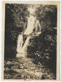 Queda d'água escalonada situada em ambiente de mata densa, identificada conforme inscrições no suporte como uma cachoeira nas terras de Augusto Bauer, no município de Brusque, Santa Catarina.