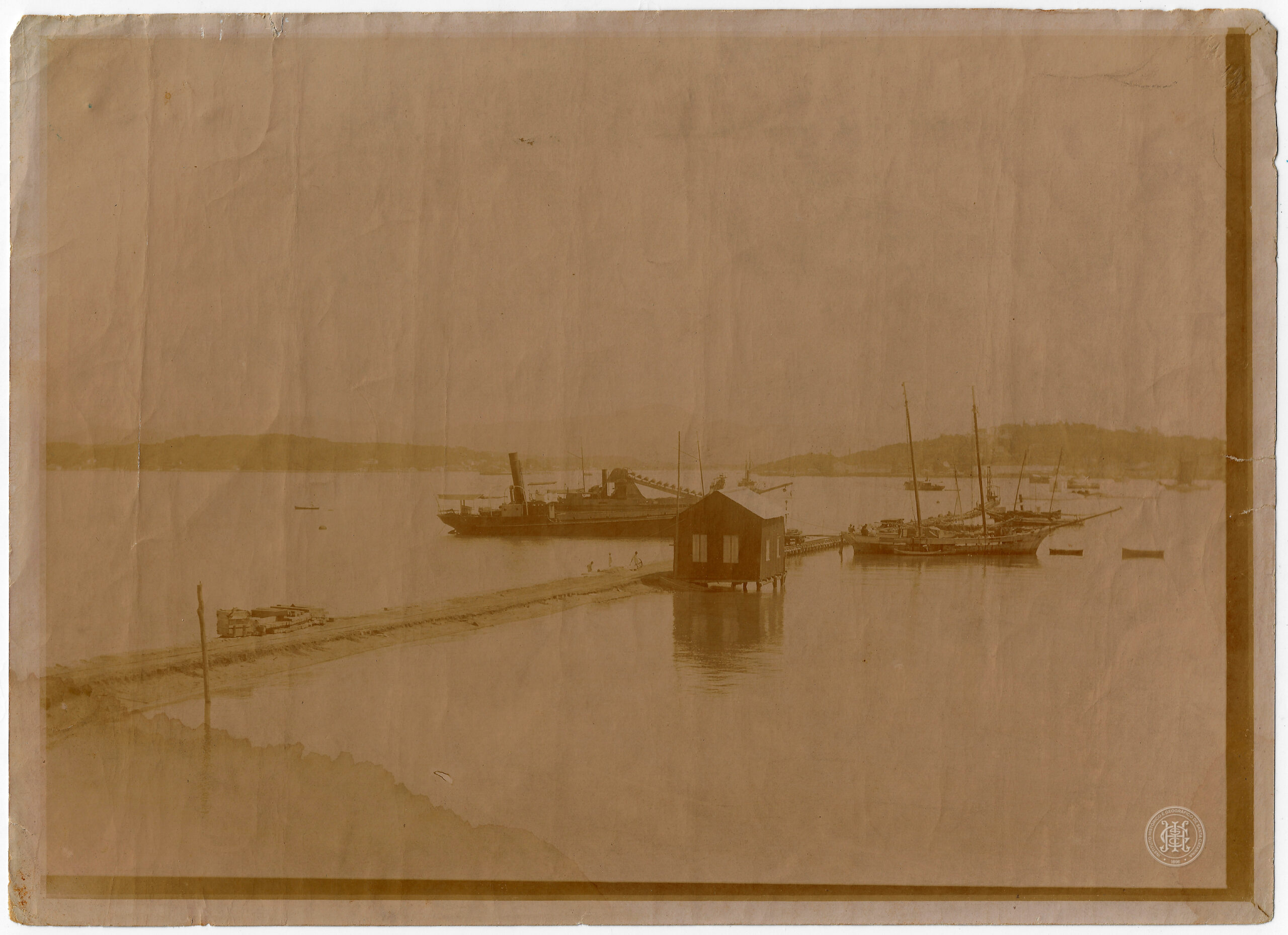 Esta fotografia registra o Cais da Prainha, em Florianópolis, Santa Catarina, no ano de 1934. A composição organiza-se a partir de uma faixa de terra ou aterro em primeiro plano, à esquerda, que conduz o olhar em perspectiva para o centro da imagem, onde se localiza uma pequena edificação de madeira sobre palafitas com janelas claras. No plano médio, à esquerda da edificação, observa-se uma embarcação a vapor com chaminé escura e faixas claras, identificada como uma draga em operação. À direita, diversas embarcações a vela e botes menores estão atracados ou fundeados nas águas calmas da baía.