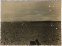 Em primeiro plano e plano médio, observa-se uma vasta extensão de terra revirada, apresentando sulcos e torrões escuros. À esquerda, no plano médio, um trator de rodas metálicas em movimento expele fumaça por seu escapamento vertical. Ao centro da imagem, quatro figuras masculinas em pé, vestindo camisas de mangas compridas e calças escuras, observam a atividade.