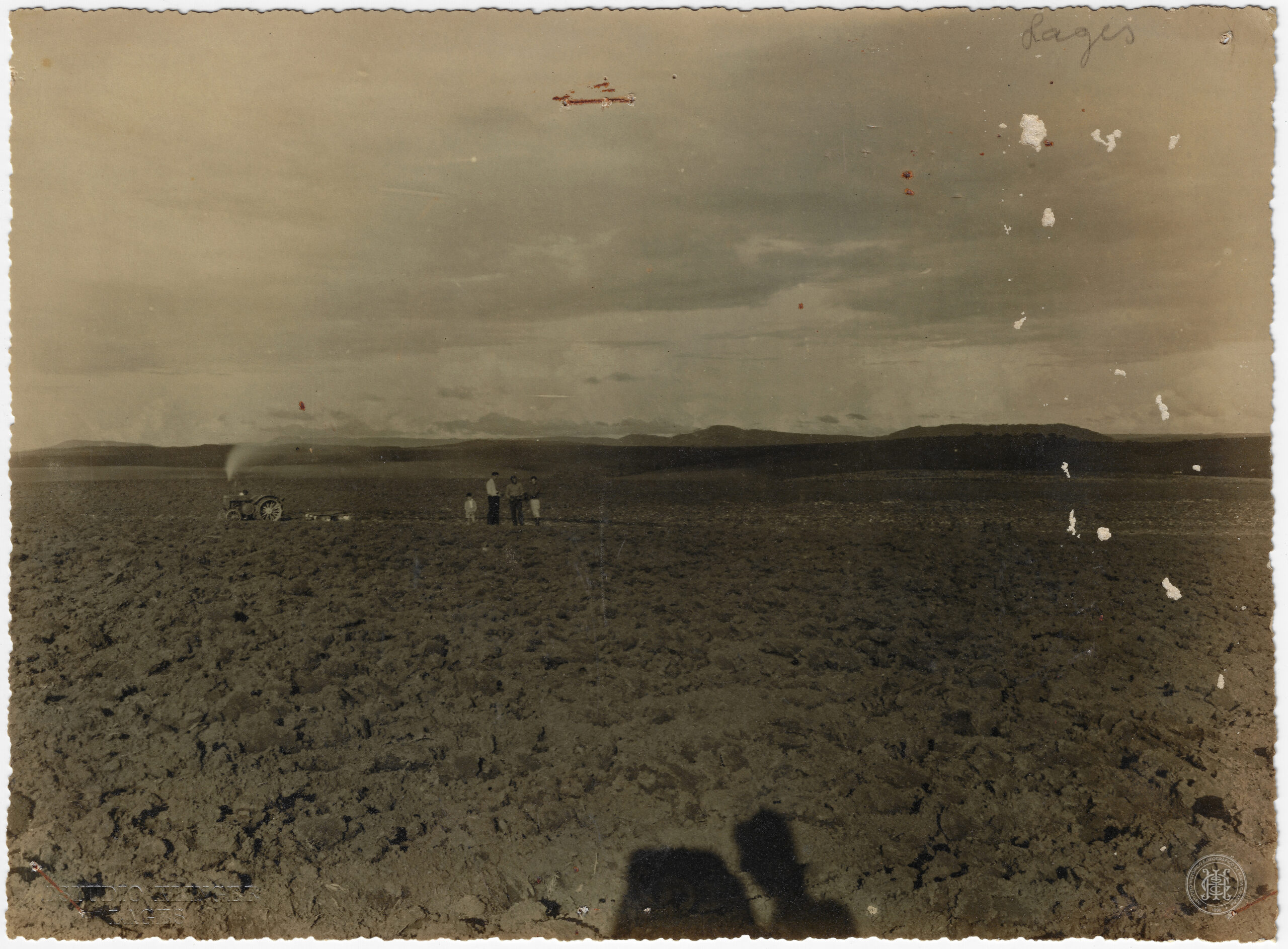 No plano de fundo, a linha do horizonte é composta por coxilhas e elevações suaves. No canto superior direito, consta a inscrição manuscrita a grafite "Lages".