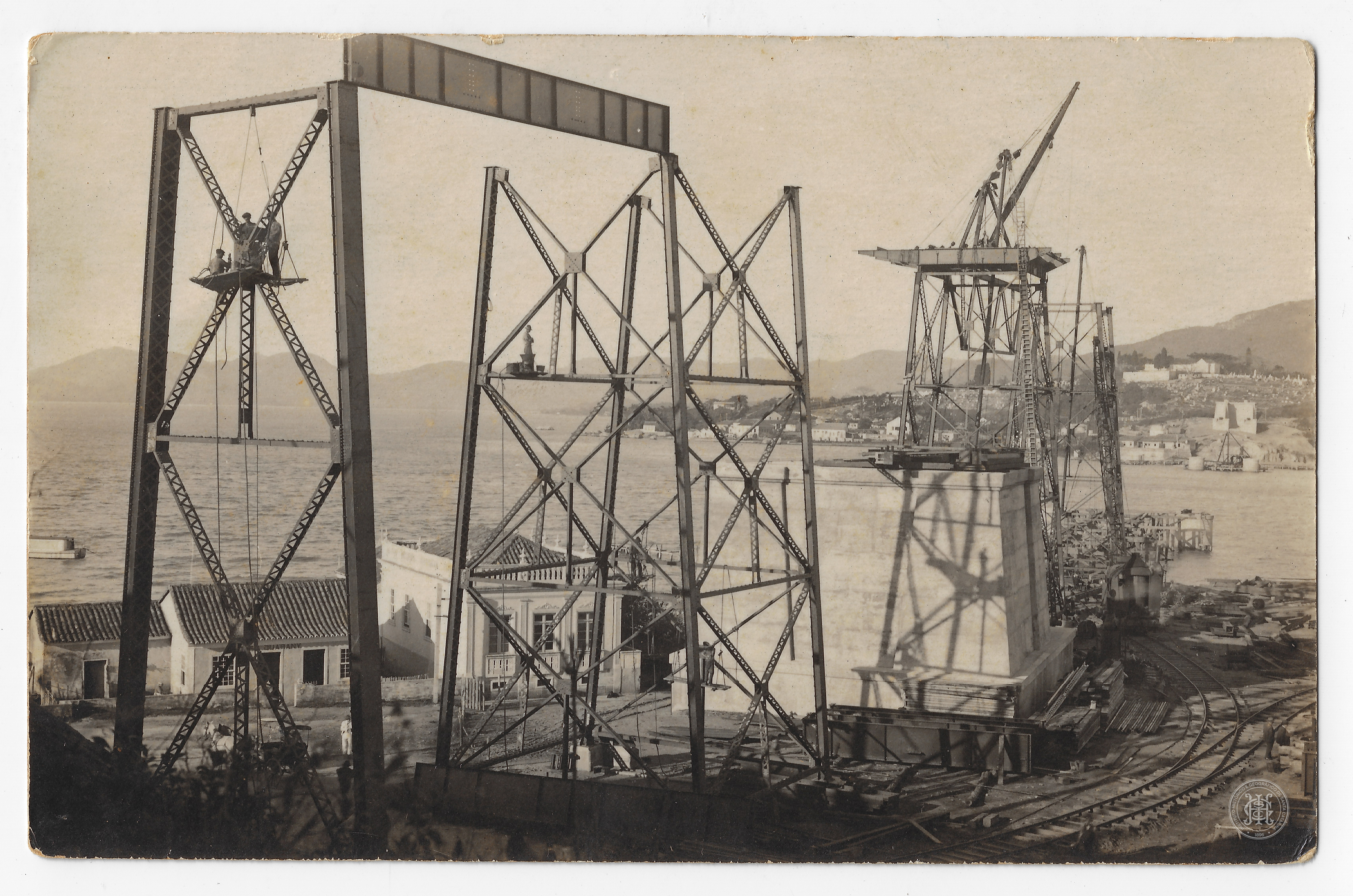 Construção da Ponte Hercílio Luz, Ponte Hercílio Luz, Florianópolis, Santa Catarina, Infraestrutura e Engenharia, Engenharia Civil, Obras Públicas, Canteiro de Obras, Estruturas Metálicas, Treliças, Guindaste, Trilhos, Ferrovia, Pilares de Alvenaria, Operários, Trabalhadores, Baía Norte, Arquitetura Eclética, Paisagem Urbana, Registro de Obra, Fotografia Documental