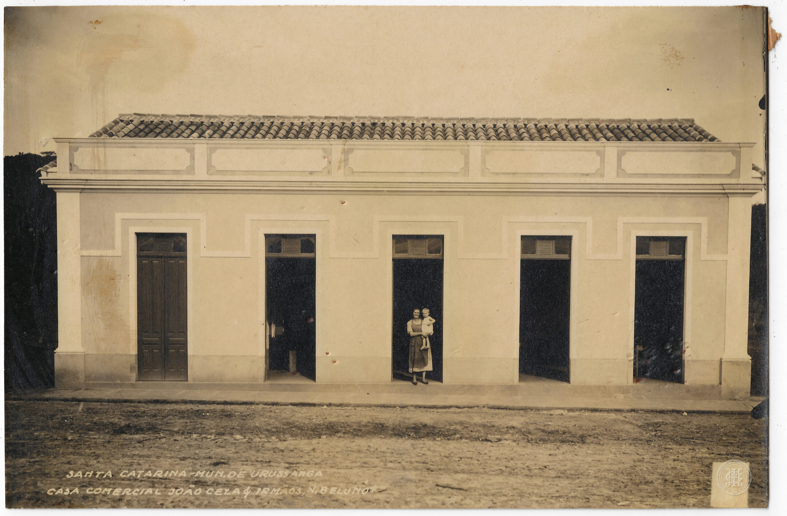 No canto inferior esquerdo do anverso, constam inscrições em letras maiúsculas brancas sobrepostas à imagem: SANTA CATARINA - MUN. DE URUSSANGA; CASA COMERCIAL JOÃO CEZA & IRMÃOS, N. BELUNO.