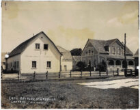 No plano médio, destacam-se duas edificações principais de alvenaria com características de arquitetura de imigração alemã: à esquerda, um edifício de dois pavimentos com telhado de duas águas e fachada branca lisa; à direita, uma construção mais ornamentada com telhado complexo, varanda frontal em arcos e detalhes decorativos nos frontões e molduras das janelas.