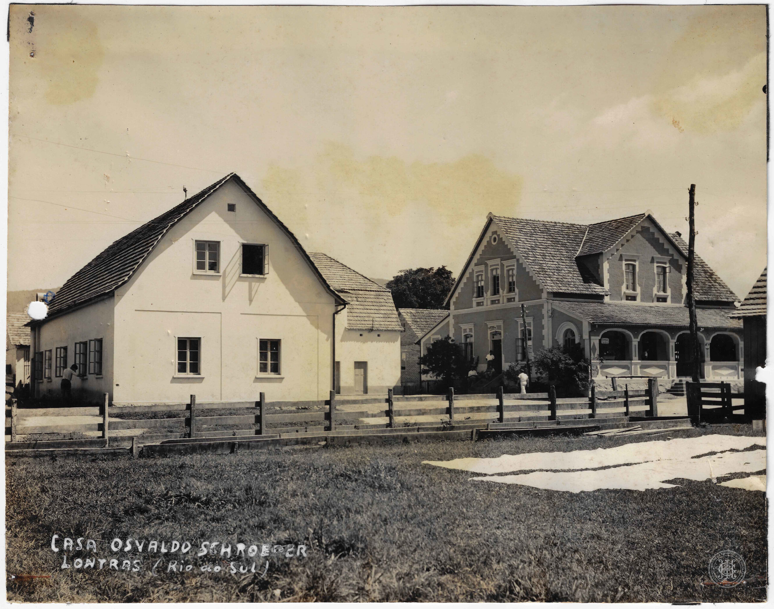 Conjunto arquitetônico identificado como Casa Osvaldo Schroeder, localizado em Lontras (Rio do Sul), Santa Catarina. A imagem organiza-se com uma área de gramado em primeiro plano, onde se observa um tecido branco estendido sobre a vegetação à direita e uma cerca de madeira baixa que delimita o terreno.