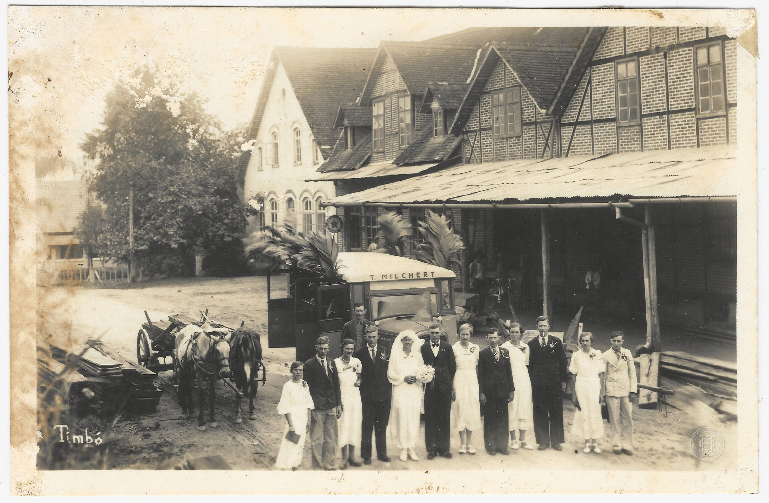 O veículo posicionado atrás do grupo exibe a inscrição "T. MILCHERT" em sua parte superior. À esquerda, em primeiro plano, observa-se uma carroça de madeira carregada de tábuas e puxada por dois cavalos. O cenário de fundo é dominado por uma imponente edificação de técnica enxaimel com múltiplos telhados empena, janelas retangulares e uma extensão coberta por telhas de zinco apoiada em pilares de madeira. No canto inferior esquerdo do anverso, consta a inscrição manuscrita "Timbó".