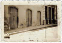 A composição foca em uma fachada térrea composta por três portas de madeira com vergas em arco abatido e molduras simples. Na primeira porta à esquerda, nota-se a inscrição vertical "CARIONI" pintada sobre a madeira.