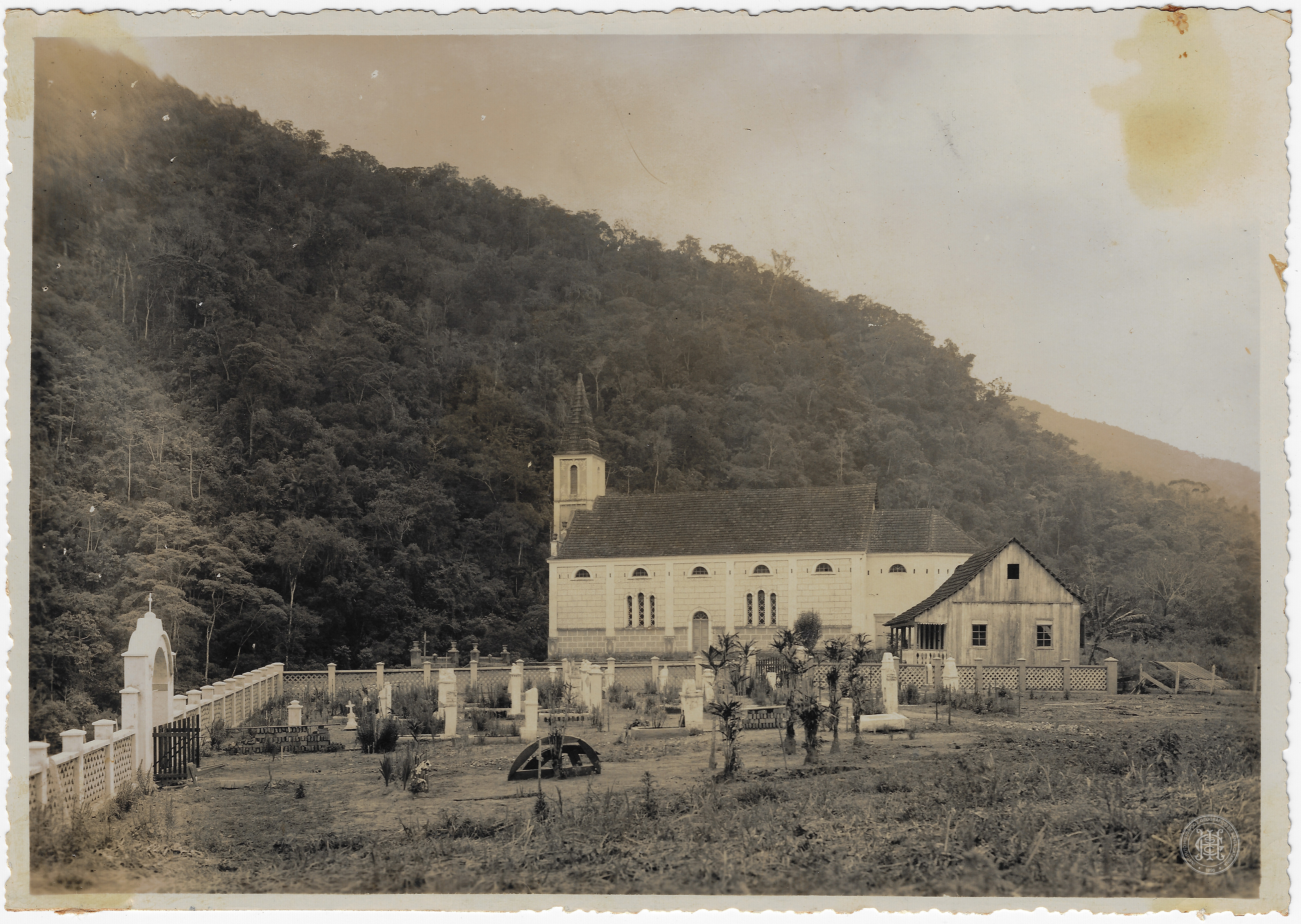 No plano médio, destaca-se uma igreja de alvenaria em estilo eclético com torre sineira lateral à esquerda, telhado de duas águas em telha cerâmica e janelas em arco pleno. À direita da igreja, encontra-se uma pequena edificação de madeira com telhado de duas águas e varanda frontal. O plano de fundo é composto por uma encosta montanhosa densamente coberta por vegetação de mata atlântica, que ocupa grande parte da composição vertical.