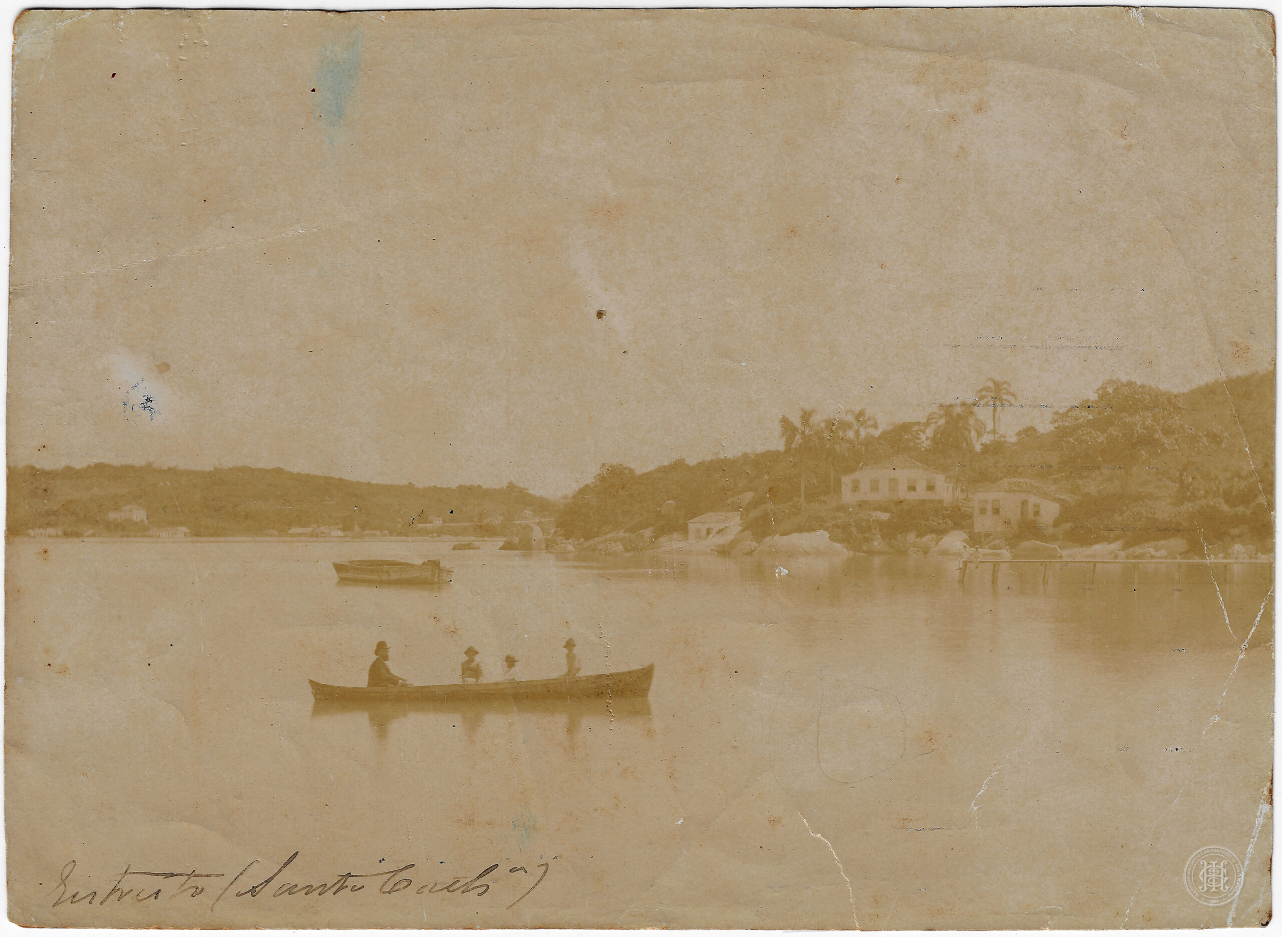 Esta fotografia horizontal registra uma cena costeira no Estreito, em Florianópolis, Santa Catarina, no início do século XX, em período anterior à construção da Ponte Hercílio Luz. A composição é organizada a partir de uma vasta lâmina d'água calma que ocupa o primeiro plano e o plano médio. No primeiro plano, centralizado à esquerda, observa-se uma embarcação de pequeno porte (canoa) com quatro ocupantes; o indivíduo à popa segura um remo, enquanto os demais permanecem sentados. Mais ao fundo, no plano médio, nota-se uma segunda embarcação desocupada próxima à margem.