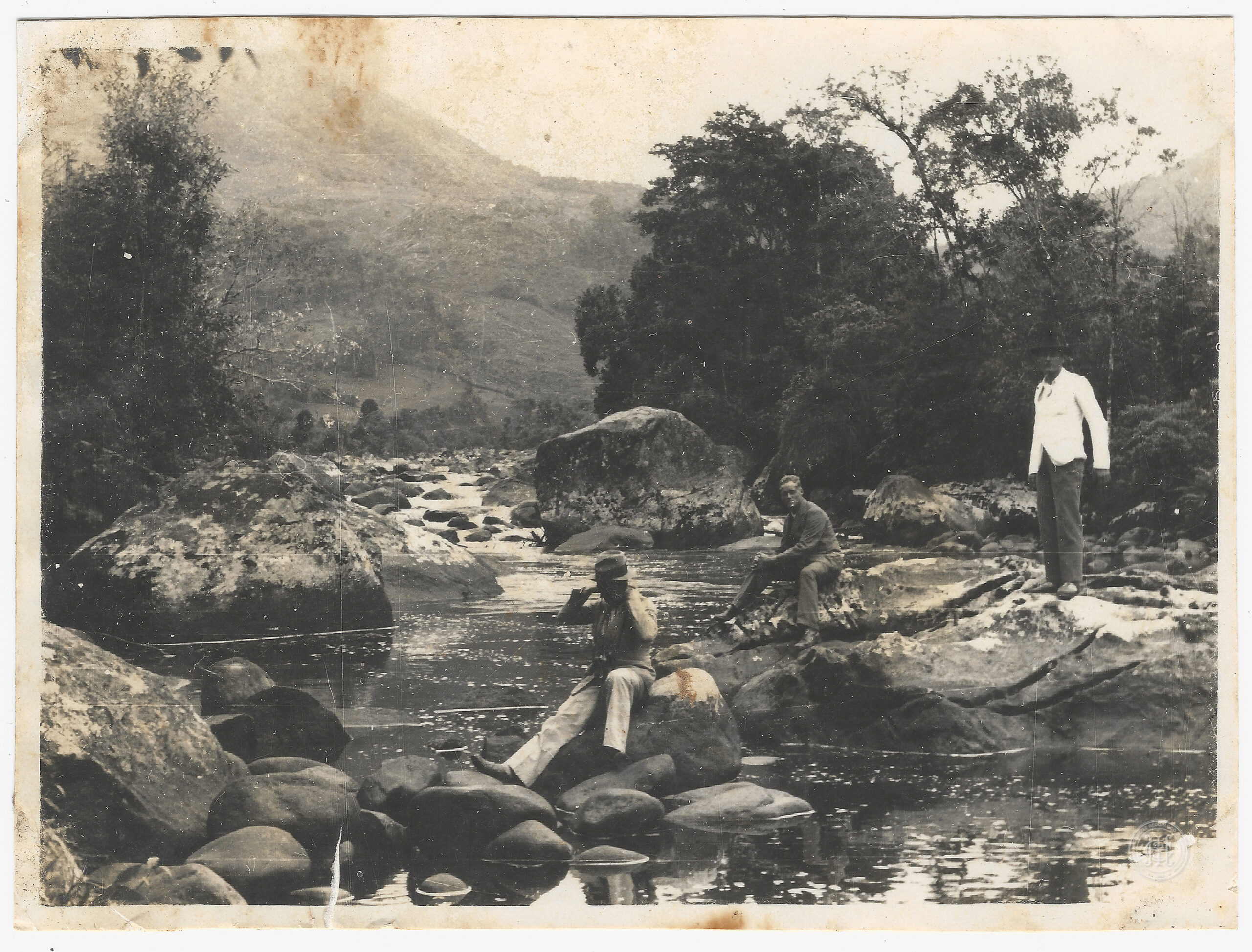A composição organiza-se em torno de um curso d'água pedregoso que atravessa a imagem do plano médio em direção ao fundo. Em primeiro plano, três homens em trajes civis ocupam a margem direita do rio; um deles está sentado sobre uma rocha ao centro, vestindo calças claras e chapéu, em postura de ajuste do acessório, um segundo indivíduo está sentado em uma rocha mais elevada ao fundo, à direita, e um terceiro homem permanece em pé na extremidade direita, vestindo paletó claro e chapéu.