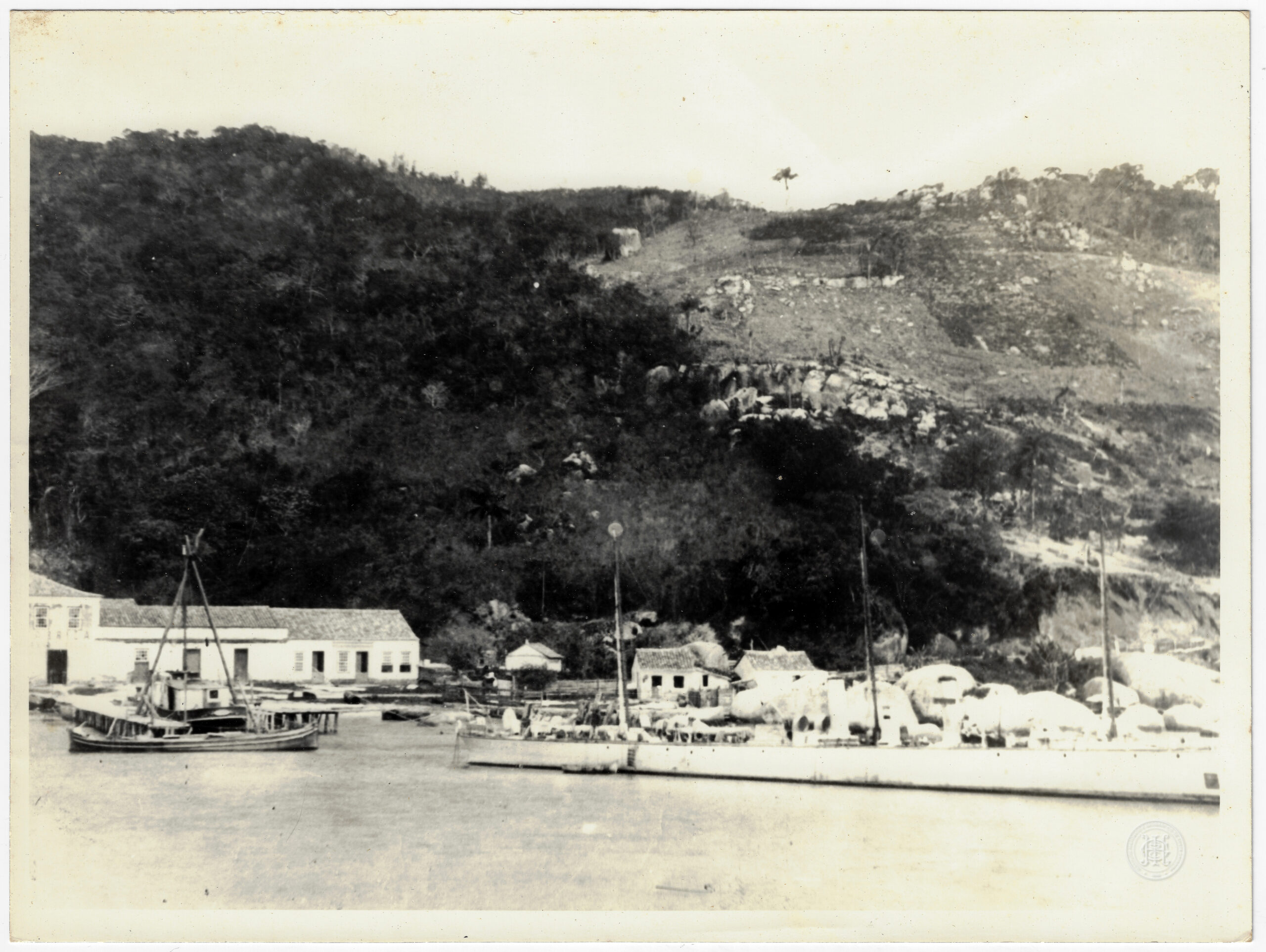 Costa litorânea, Florianópolis, Santa Catarina, Ilha de Santa Catarina, Paisagem Urbana, Paisagem Litorânea, Porto, Cais, Trapiche, Embarcações, Barco a motor, Arquitetura Luso-brasileira, Armazéns, Morro, Encosta, Vegetação, Mata Atlântica, Formações Rochosas, Gênero Paisagem, Fotografia Documental, Infraestrutura Portuária, Estilo Colonial