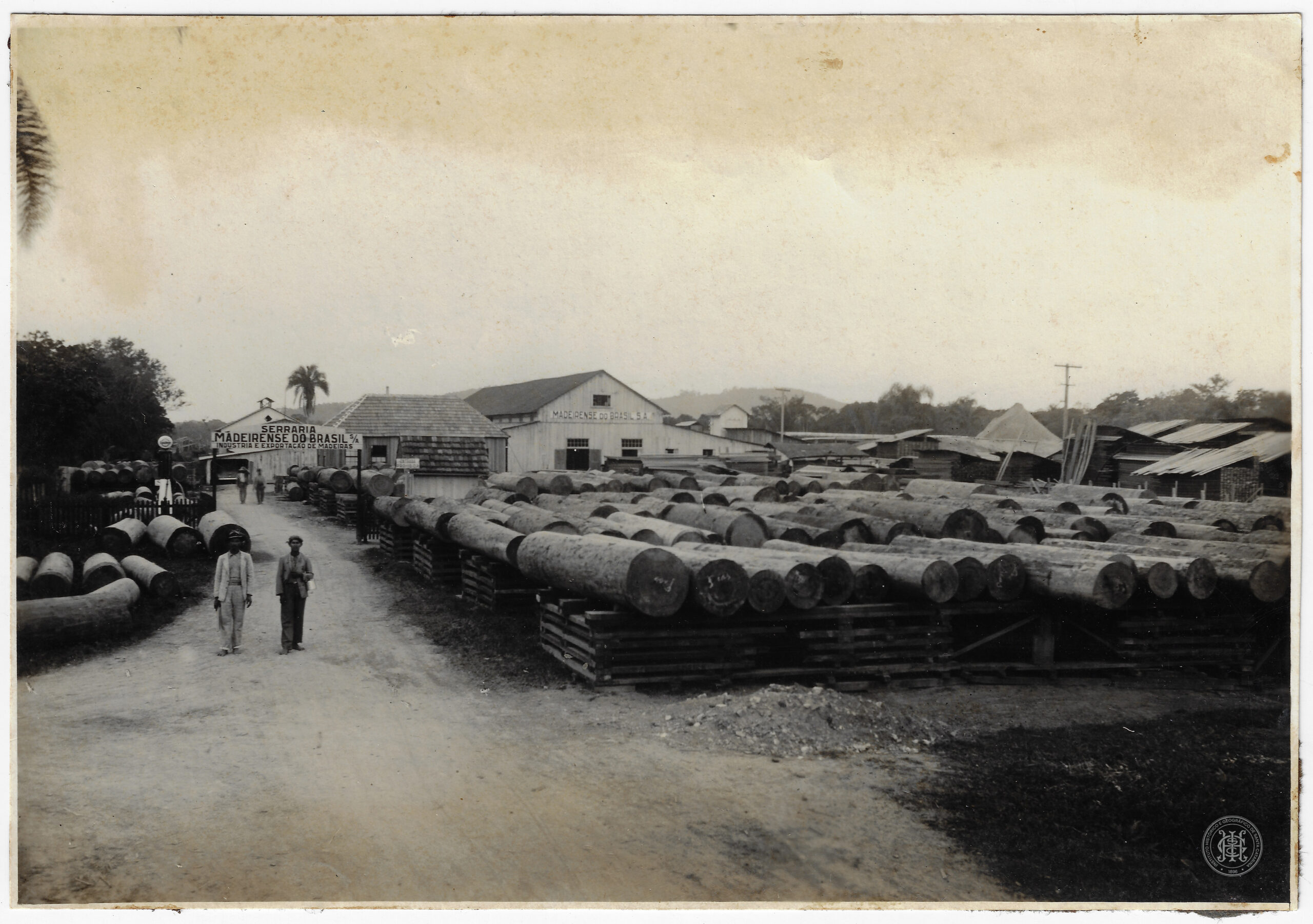 Indústria, Serraria, Madeira, Toras de madeira, Cia Industrial Exportadora de Madeira, Madeirense do Brasil S/A, Pátio de estocagem, Galpão, Arquitetura industrial, Exportação, Economia, Joinville, Santa Catarina, Trabalhadores, Chapéu, Estrada de terra, Palmeira, Vegetação, Poste, Década de 1930, 1939