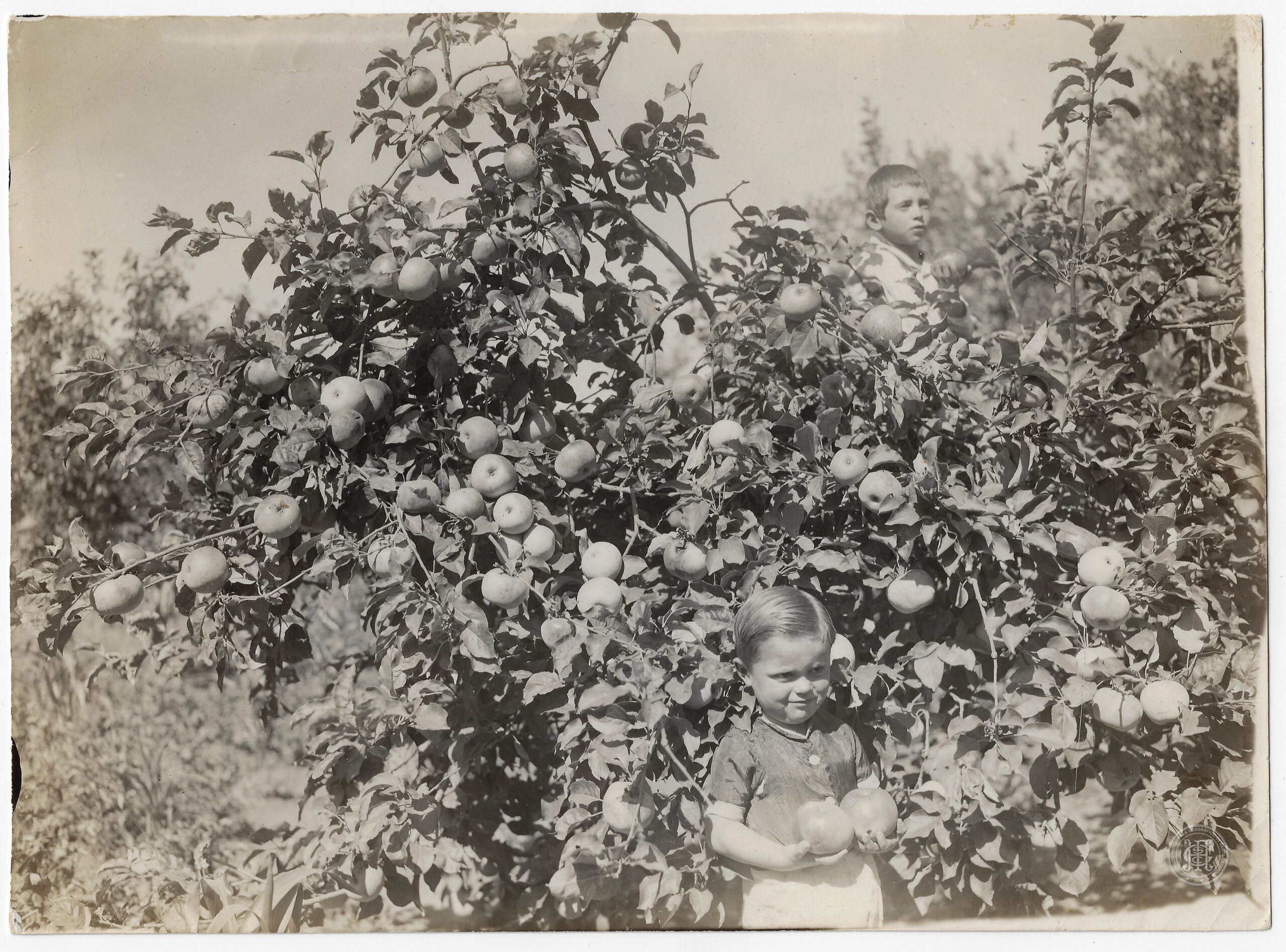 Duas crianças num pomar de macieiras carregado de frutos, em São Joaquim, Santa Catarina. A composição é dominada por uma grande macieira no plano médio, cujos ramos pendem pesadamente sob o peso de numerosas maçãs de tamanho médio. Em primeiro plano, no canto inferior direito, uma criança mais nova, com cabelo curto e claro, veste uma camisa escura de mangas curtas sobre o que parece ser um avental ou calças claras, e segura duas maçãs nas mãos, olhando para a direita da câmara com uma expressão serena.