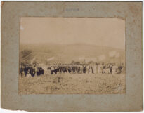 Grupo de pessoas da Colônia Russa de Rio Novo, em Orleans, Santa Catarina, em 06 de junho de 1903. A imagem apresenta uma composição organizada em planos horizontais, com o grupo posicionado no plano médio sobre um terreno com vegetação rasteira e densa.