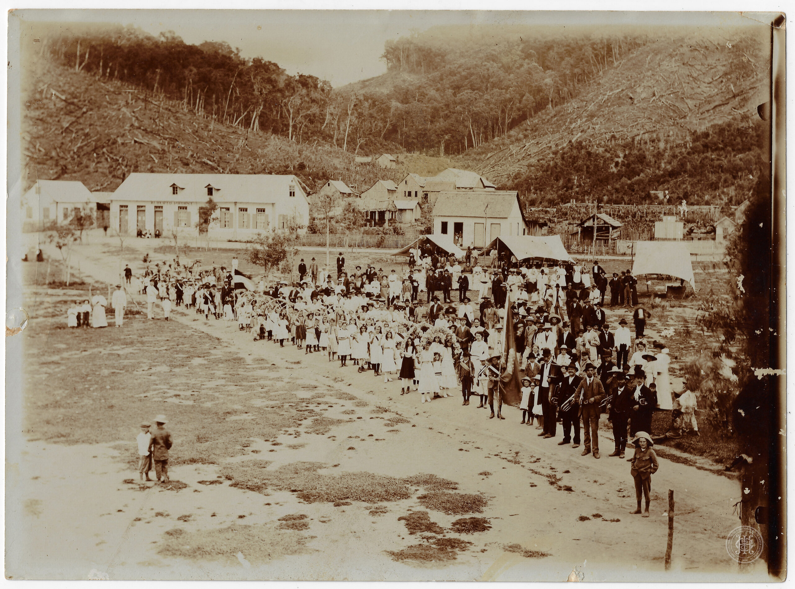 Grande concentração popular em um espaço aberto na Colônia Teresópolis, Santa Catarina, em 25 de dezembro de 1912. A imagem organiza-se em três planos principais: no primeiro plano, à esquerda, dois sujeitos de costas observam a cena, enquanto à direita um jovem encara a câmera. No plano médio, uma multidão composta por homens, mulheres e numerosas crianças vestidas com trajes formais claros (vestidos e camisas brancas) organiza-se em uma espécie de cortejo ou celebração. À direita, destaca-se um grupo de homens portando instrumentos musicais e estandartes, sugerindo a presença de uma banda ou sociedade local.