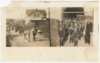 A imagem é composta por dois registros distintos fundidos horizontalmente. À esquerda, observa-se um cortejo em uma estrada de terra, liderado por uma pequena banda composta por jovens músicos trajando paletós e chapéus, portando instrumentos de sopro e percussão. Logo atrás, segue um grupo de crianças carregando bandeiras. Ao fundo deste lado, destaca-se uma edificação de dois pavimentos com telhado de duas águas e uma varanda frontal, além de postes de rede elétrica.