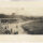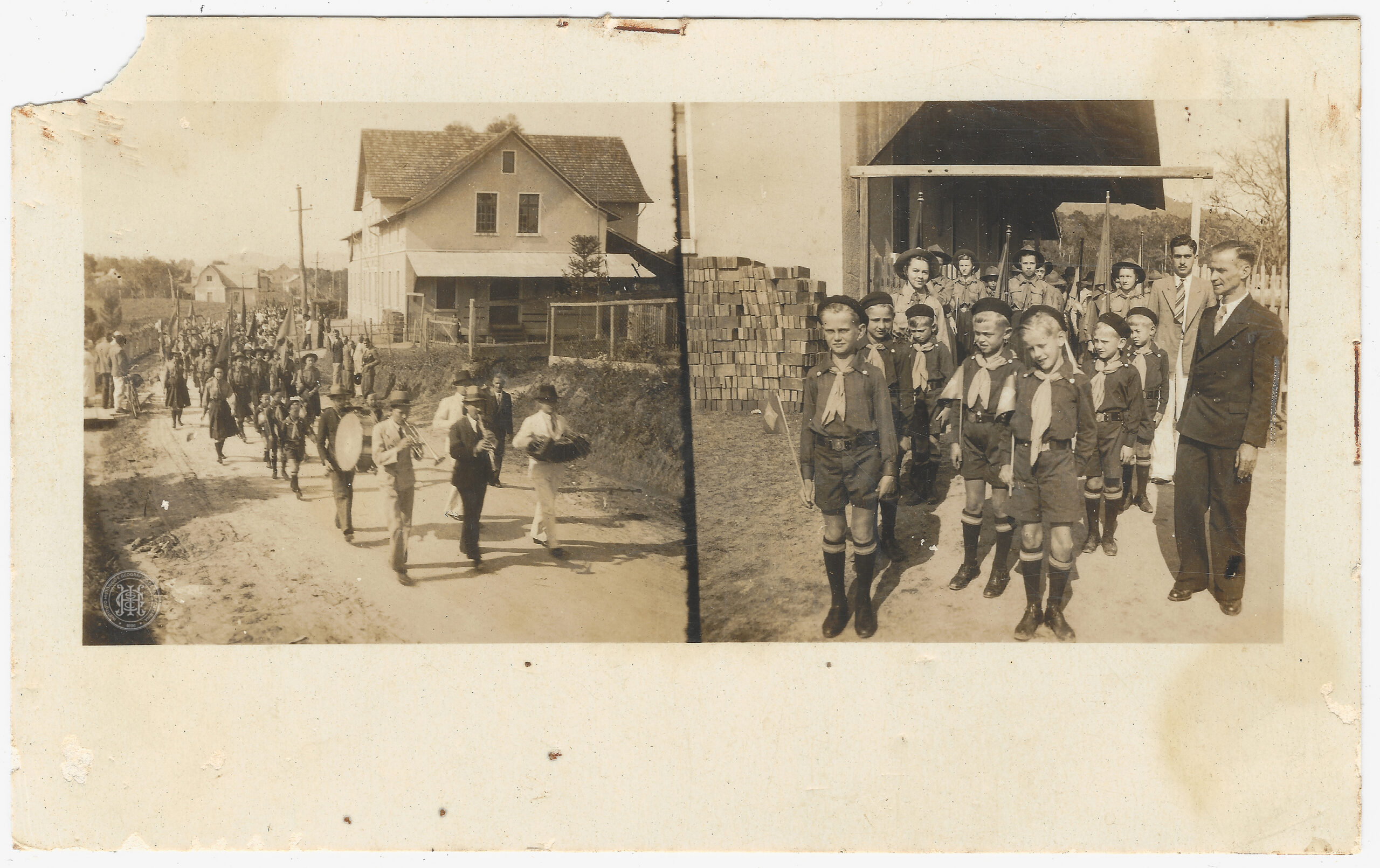 À direita, a cena apresenta um grupo de meninos em primeiro plano, perfilados e trajando uniformes de estilo escoteiro, compostos por camisas de mangas longas, lenços claros ao pescoço, bermudas escuras, meias altas e boinas. Ao lado do grupo, à direita, dois homens adultos vestindo ternos acompanham a formação. No plano de fundo deste lado, observam-se pilhas de materiais de construção, possivelmente tijolos ou blocos de madeira, sob uma estrutura coberta.