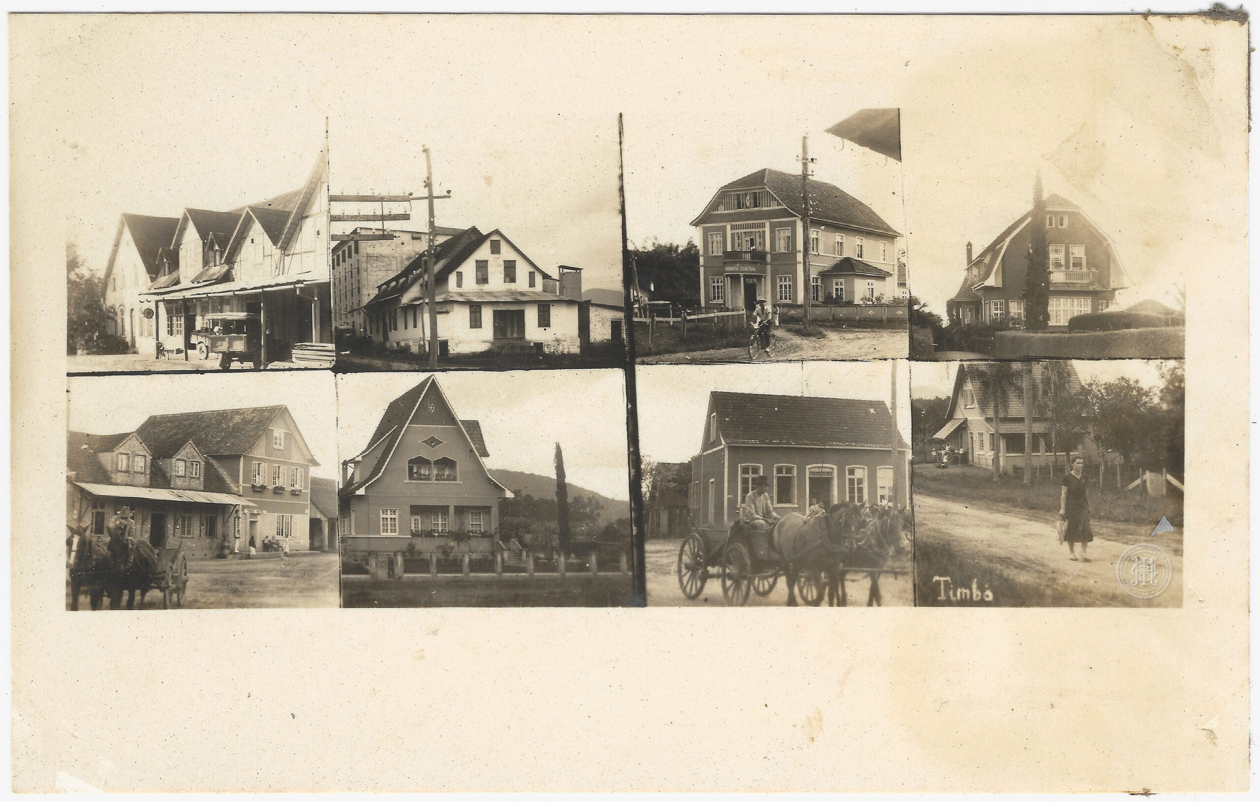 O conjunto documenta a arquitetura e o cotidiano urbano de Timbó, Santa Catarina, no ano de 1938. Na fileira superior, as imagens mostram, da esquerda para a direita: