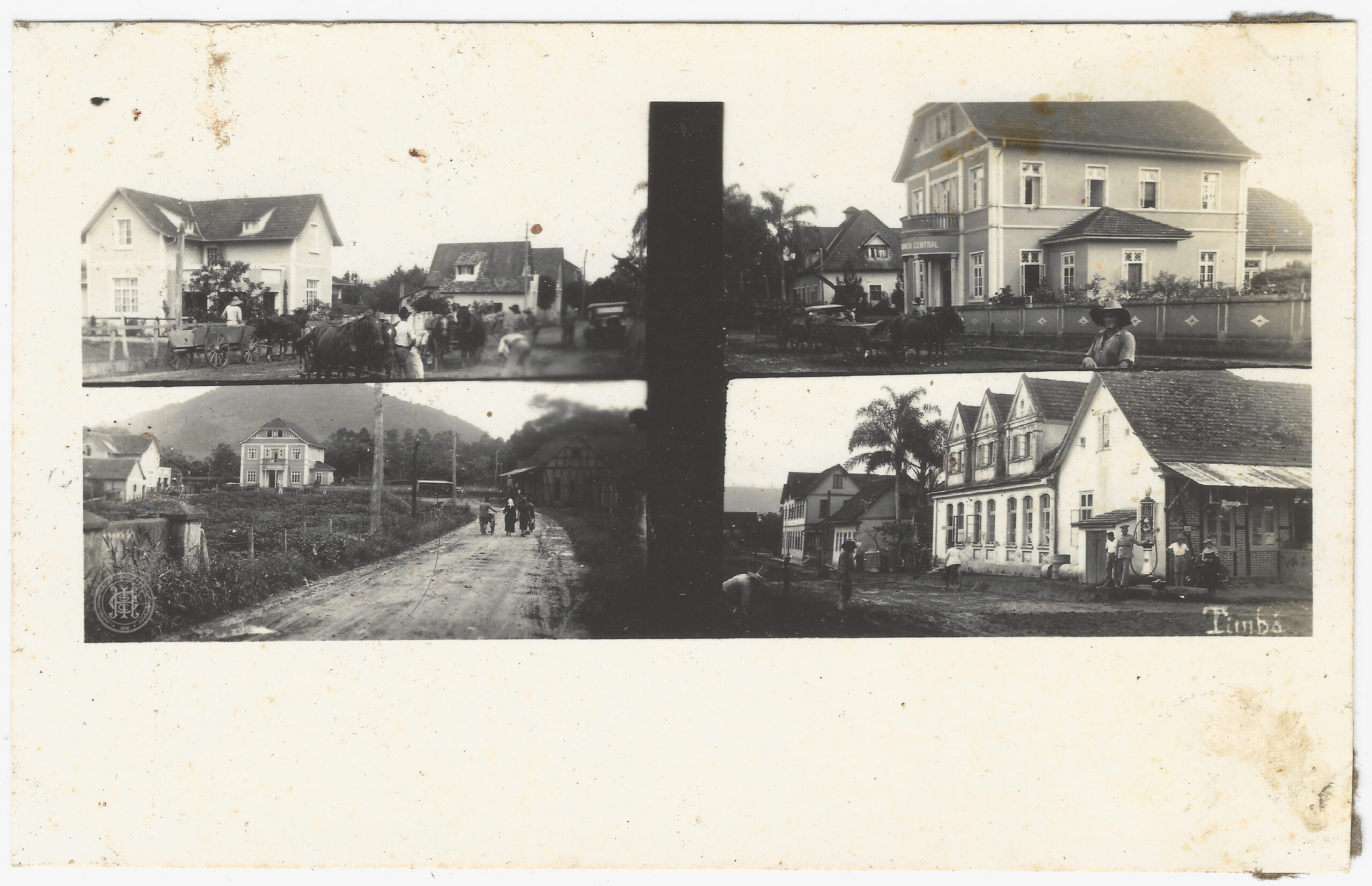 Quatro quadros distintos separados por margens brancas e uma faixa preta central, apresenta vistas urbanas e rurais de Timbó, Santa Catarina, no ano de 1938.