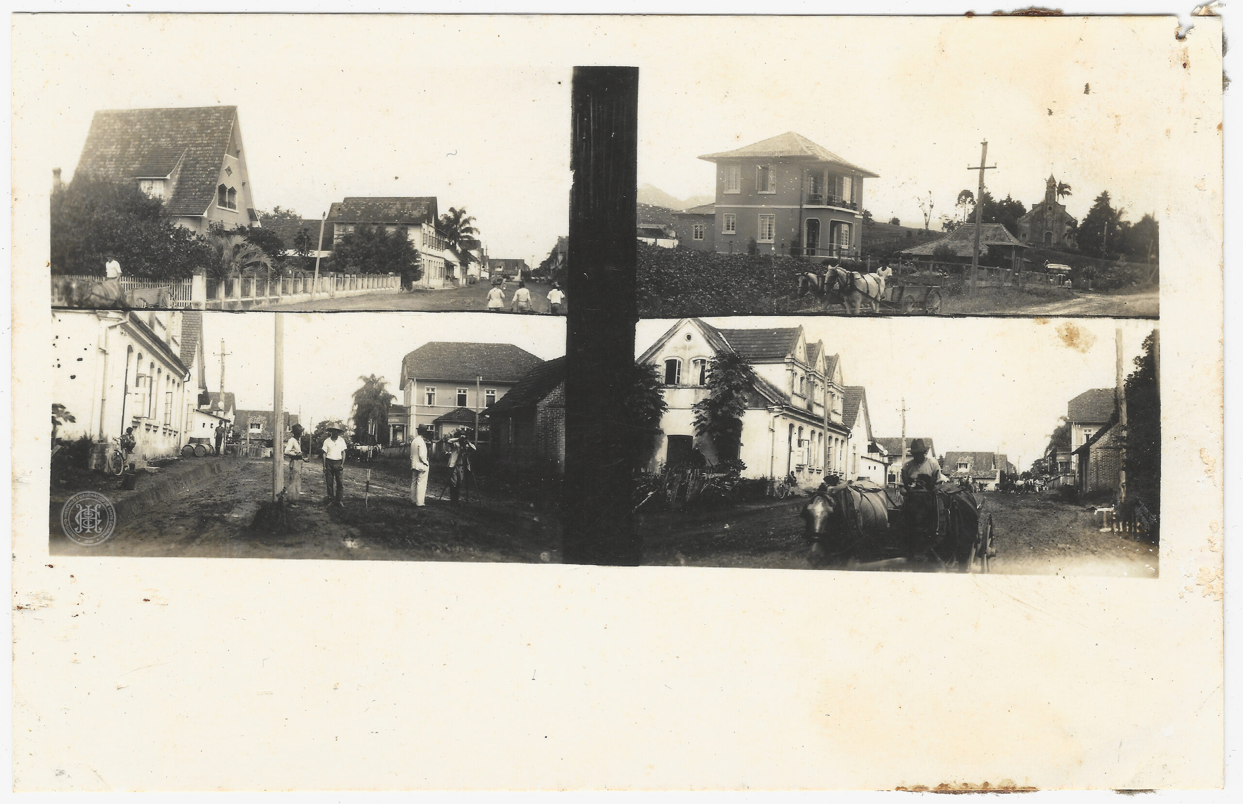Na segunda fileira, a imagem à esquerda apresenta uma rua de terra batida com poças de água e figuras masculinas posando, ao fundo desta cena, é visível a edificação que sediava a Drogaria e Pharmácia Central. A imagem à direita da segunda fileira registra uma carroça carregada e tracionada por cavalos sendo conduzida por um homem em frente a um conjunto de edificações em enxaimel.