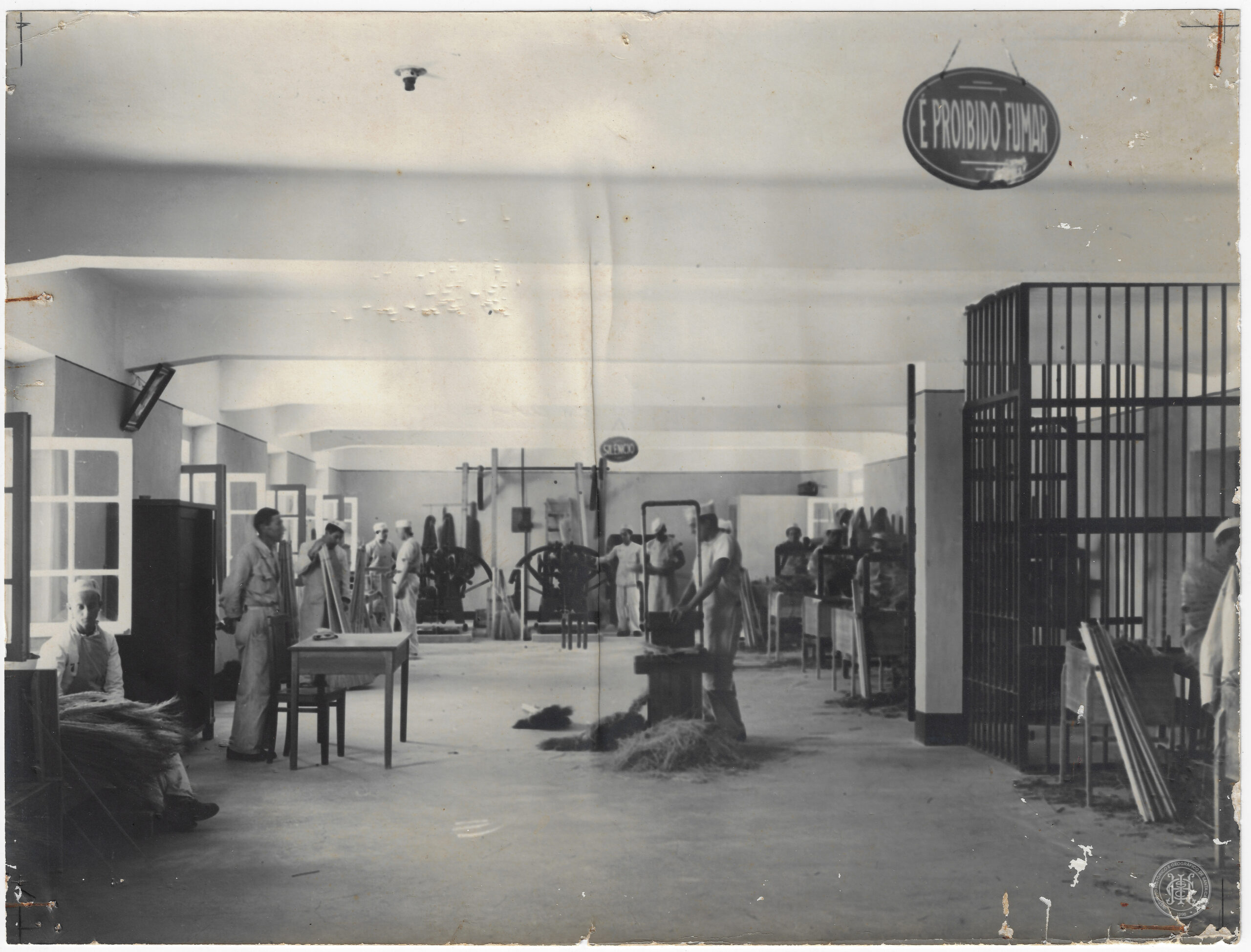No plano médio, diversos homens vestindo uniformes de cor clara e chapéus tipo boné operam máquinas manuais e bancadas de trabalho. Há pilhas de matéria-prima (fibras vegetais) no chão e maços de cabos de madeira encostados nas paredes. À direita, destaca-se uma grande estrutura de grade metálica que delimita um espaço interno.