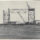 Em primeiro plano, a superfície da água apresenta ondulações suaves e reflexos da luz solar. No plano médio, à direita, destaca-se uma estrutura de escoramento e andaimes de madeira sobre o mar, que sustenta dois pilares cilíndricos de concreto e um guindaste metálico de torre dotado de braço longo e sistema de cabos. Ao centro, uma pequena embarcação a remo é visível próxima às estruturas. À esquerda, a linha de costa revela o canteiro de obras terrestre, com o maciço pilar de concreto (encontro) da ponte apresentando duas aberturas circulares características e estruturas metálicas de pórtico em fase de montagem no topo de um promontório.