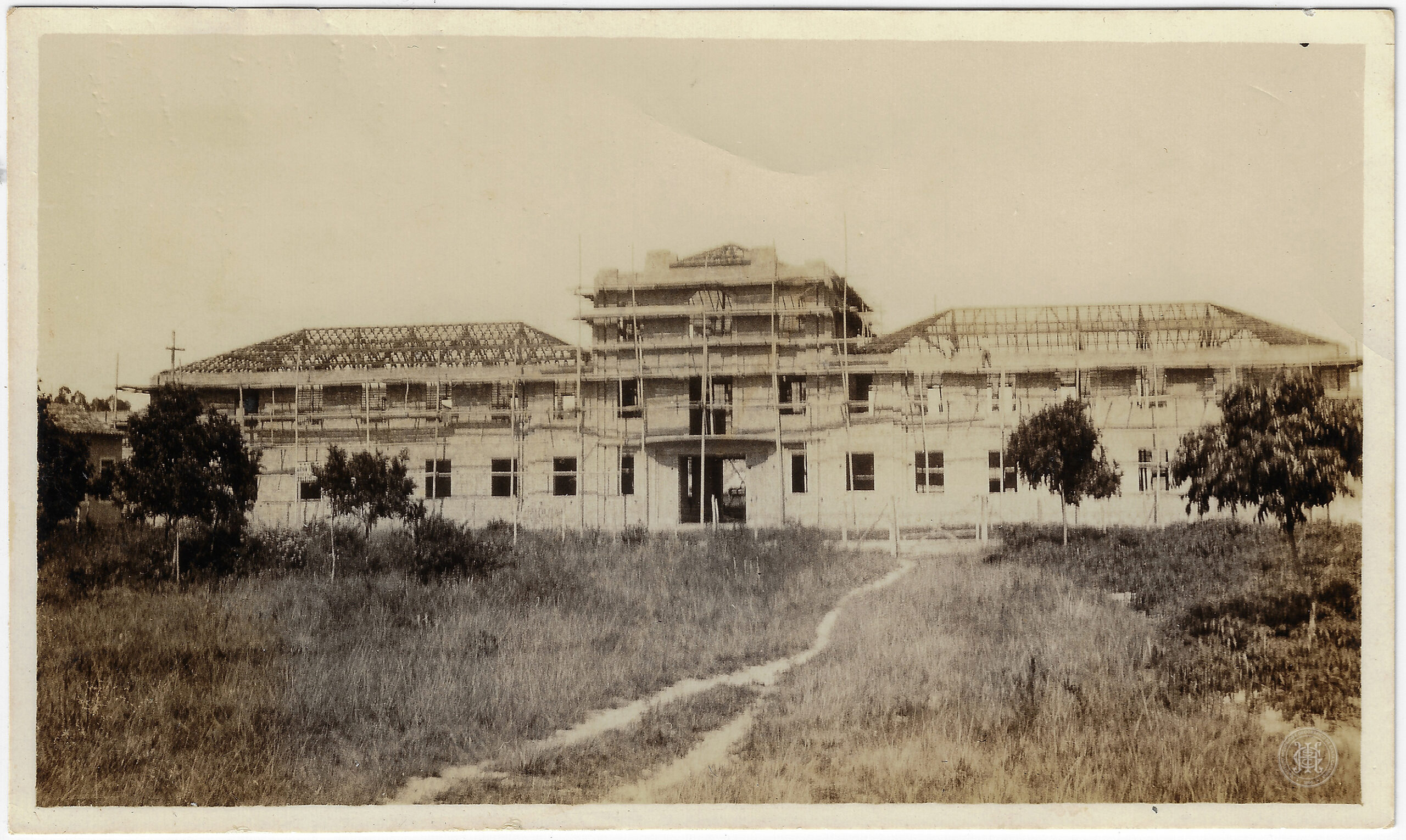 Esta fotografia registra a fase de construção das instalações do 14° Batalhão de Caçadores (atual 63° Batalhão de Infantaria) em Florianópolis, Santa Catarina. A edificação militar, de grandes dimensões e simétrica, apresenta-se em estágio avançado de estrutura, com o madeiramento do telhado (tesouras e caibros) aparente e sem cobertura em toda a sua extensão. O corpo central é mais elevado e possui um frontão e andaimes de madeira instalados em sua fachada, indicando o trabalho em curso. As alas laterais apresentam sucessões de janelas retangulares, ainda sem esquadrias, distribuídas em dois pavimentos.