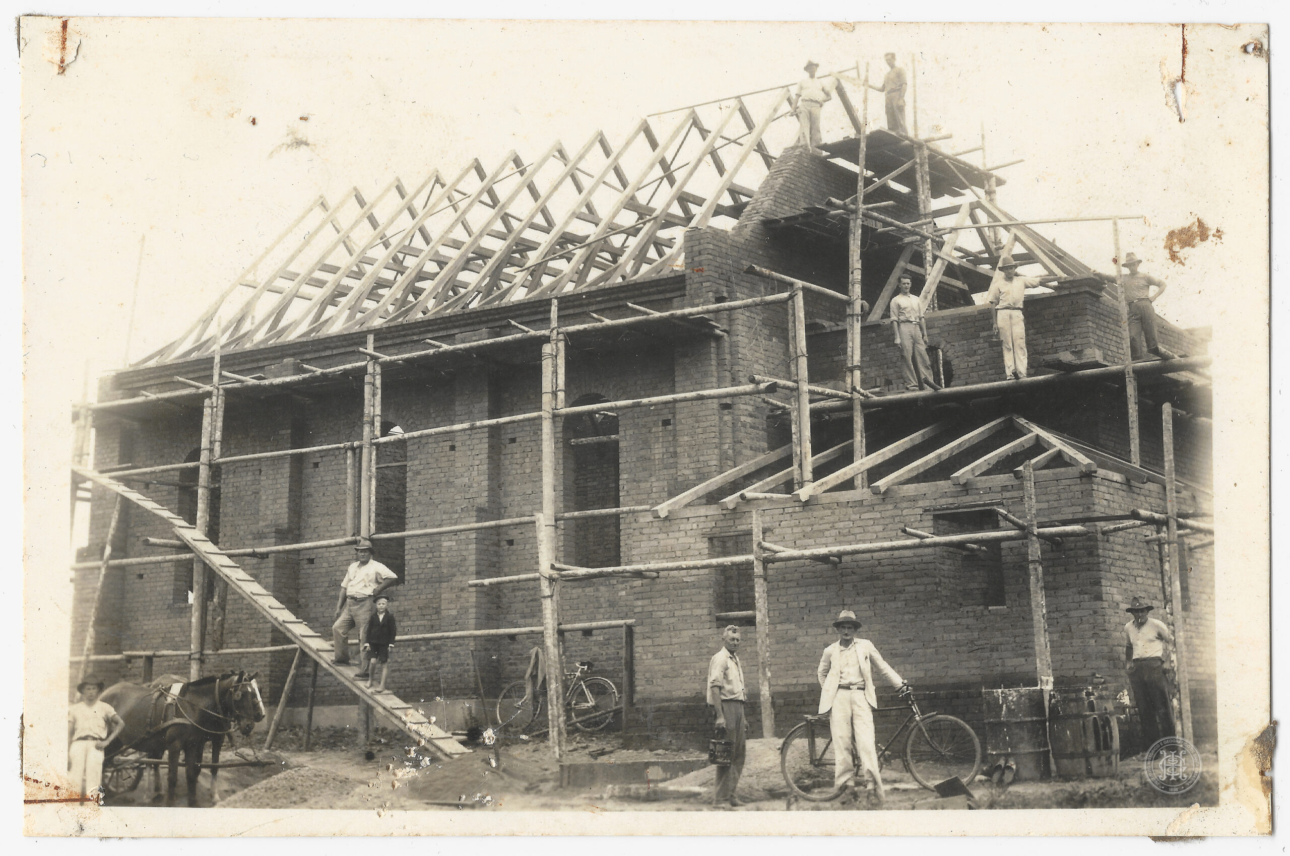 Arquitetura, Edificação, Construção Civil, Obras Públicas, Tijolo aparente, Andaime, Telhado, Vigamento, Trabalhadores, Grupo, Homens, Criança, Cavalo, Carroça, Bicicleta, Canteiro de obras, Timbó, Santa Catarina, Vale do Itajaí, Registro de evento, Meios de transporte, Trabalho