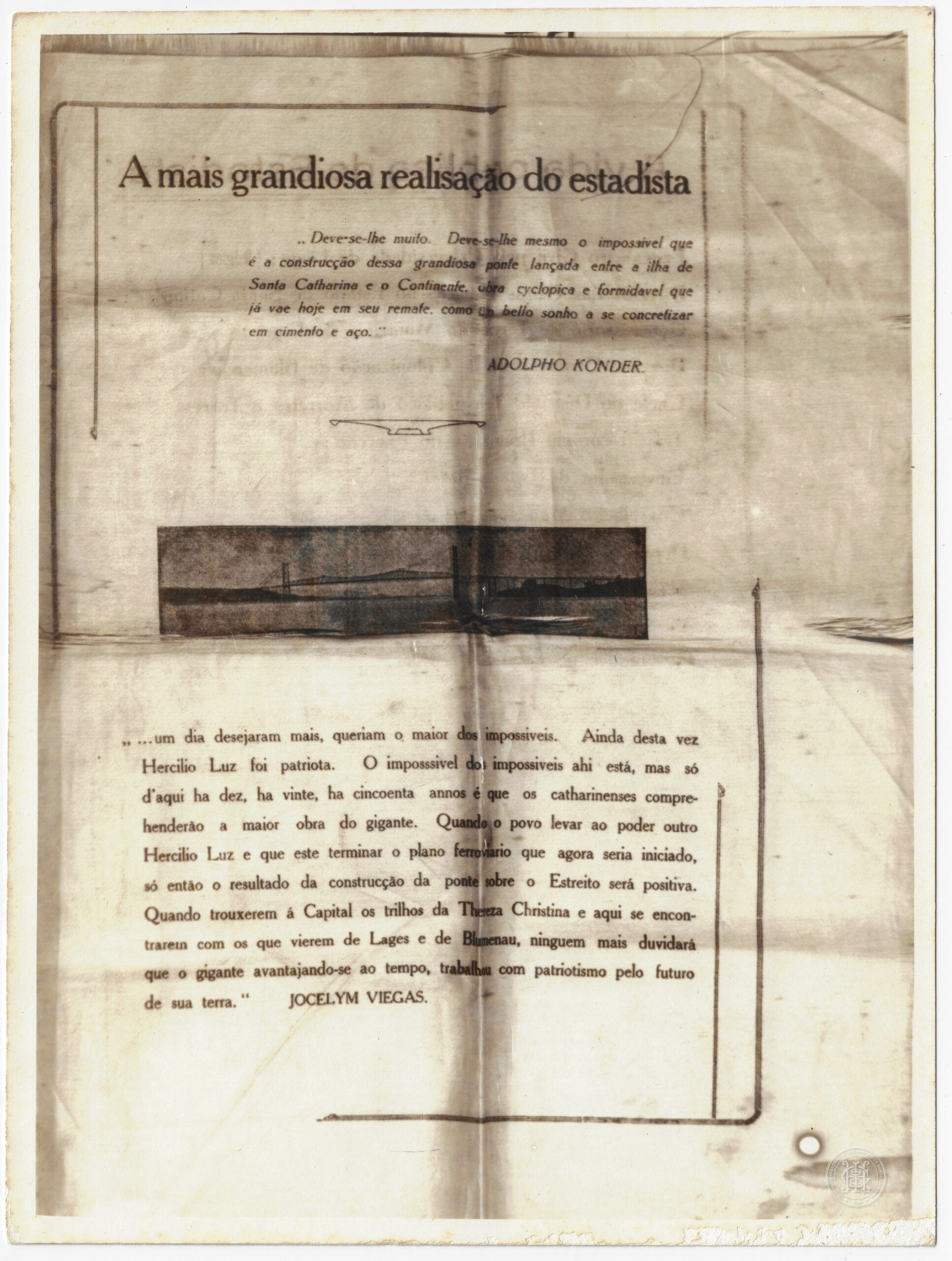 Hercílio Pedro da Luz, Adolpho Konder, Adolfo Konder, Jocelyn Viegas, Ponte Hercílio Luz, Florianópolis, Santa Catarina, História de Santa Catarina, Integração Ferroviária, Estreito, Ilha de Santa Catarina, Inauguração, Convite, Documento Histórico, Década de 1920, Patrimônio Cultural, Infraestrutura, Engenharia