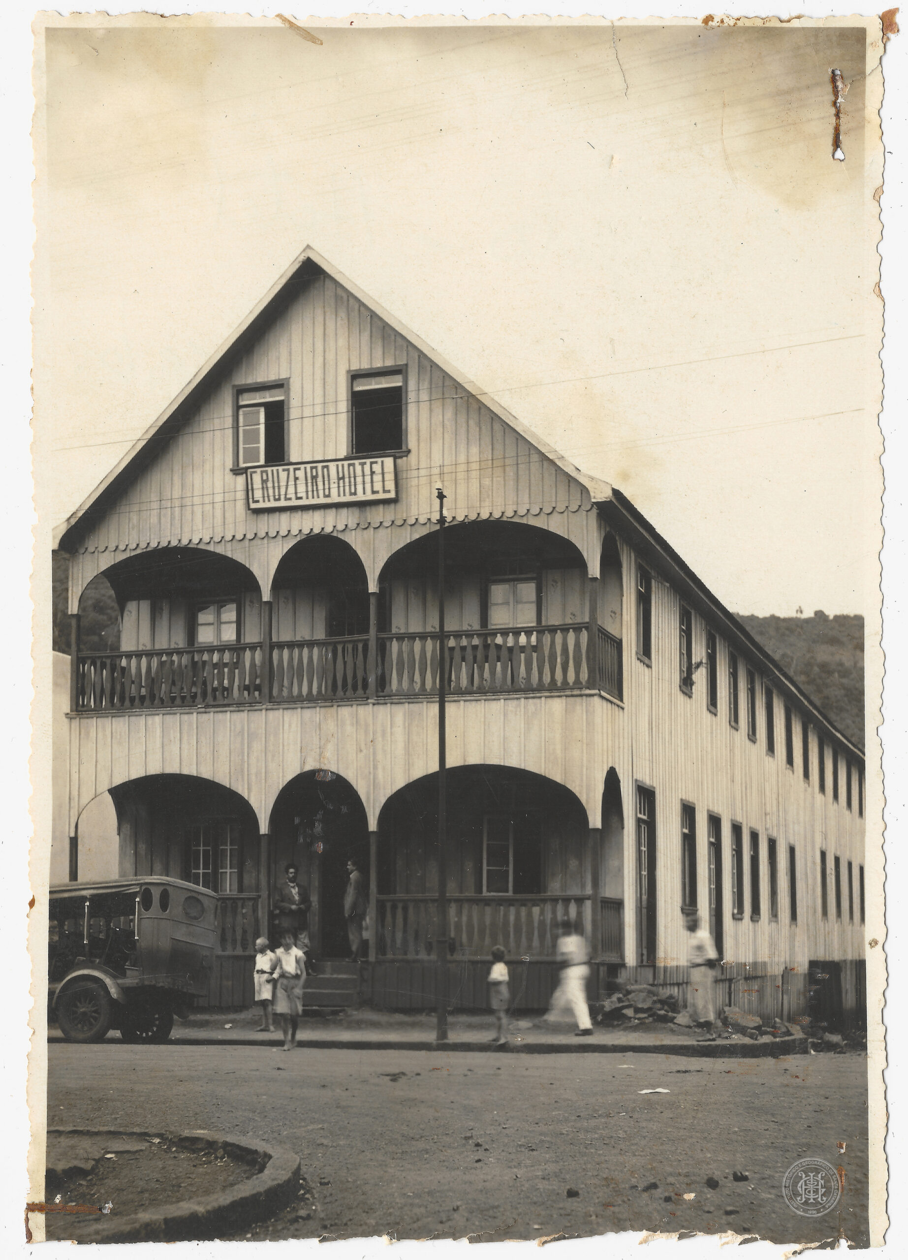 À esquerda, parte de um veículo antigo (possivelmente um ônibus ou caminhão de pequeno porte) está estacionado. Figuras humanas em movimento, incluindo crianças e adultos, ocupam a área em frente ao hotel e a calçada lateral, conferindo dinamismo à cena urbana.