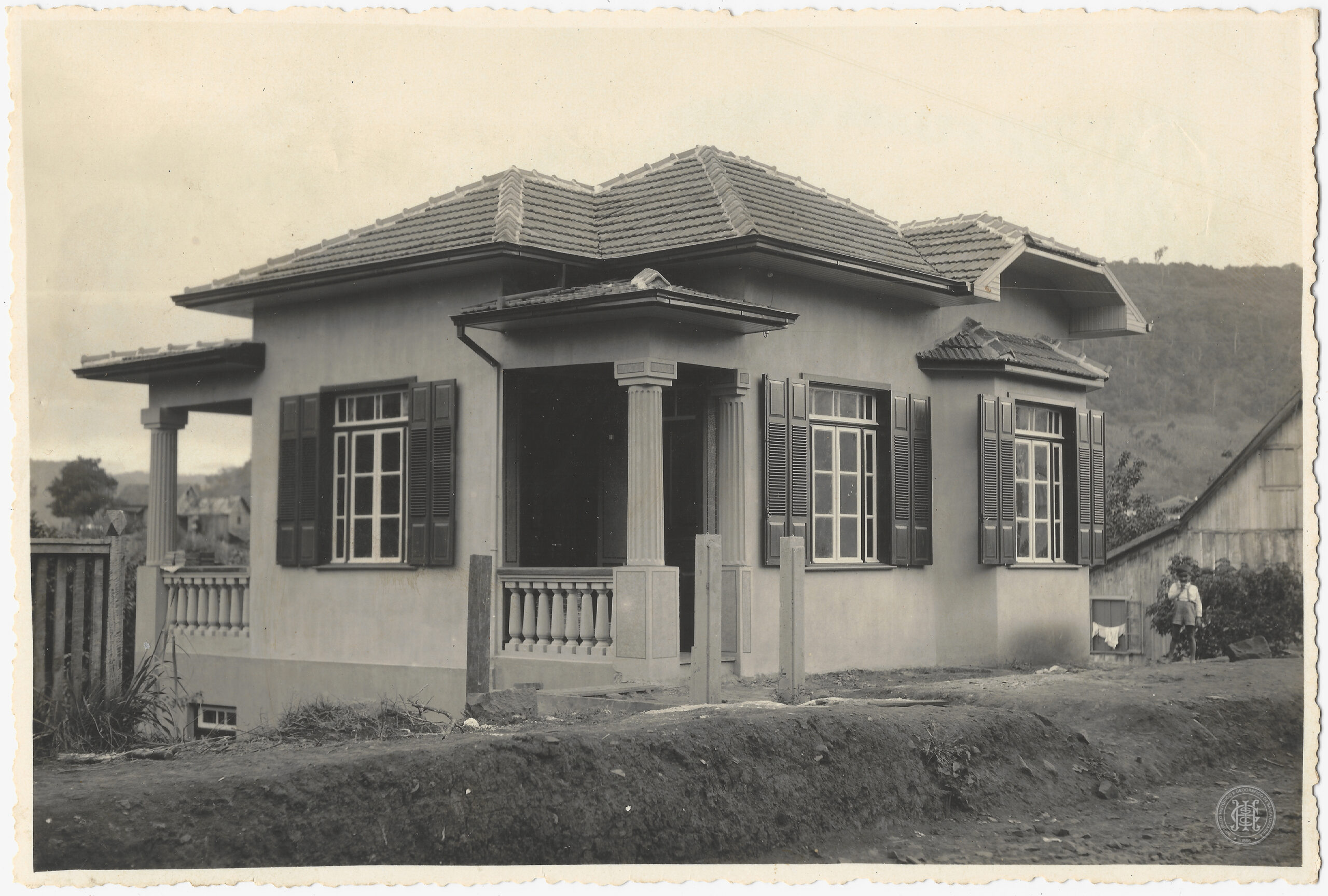 Residência de alvenaria em estilo eclético localizada Joaçaba, Santa Catarina. A edificação possui um telhado complexo de múltiplas águas com telhas cerâmicas francesas e beirais salientes.