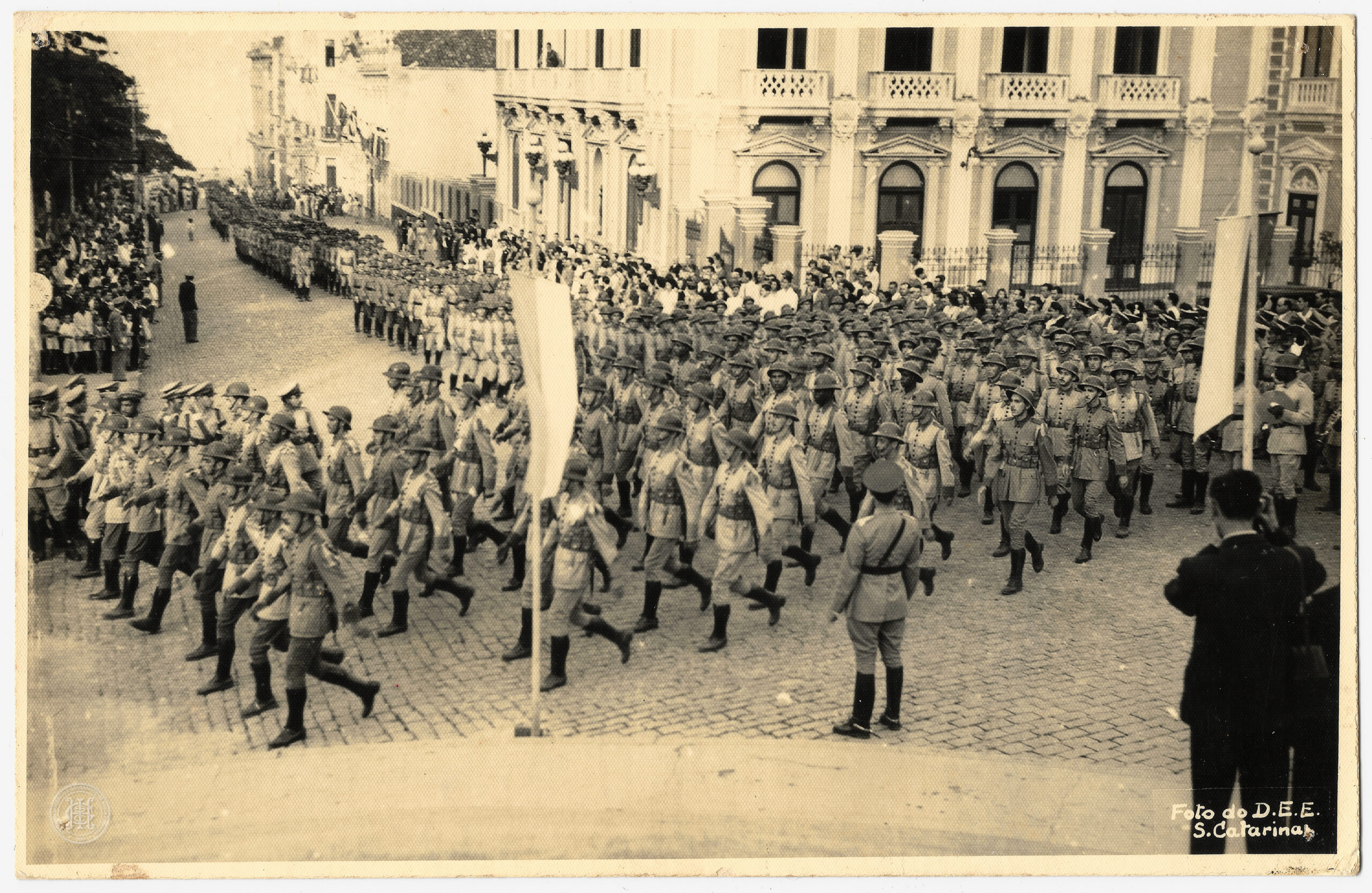 A composição apresenta um plano geral com ângulo ligeiramente elevado, permitindo visualizar a extensão da tropa que ocupa a via pavimentada em paralelepípedos. Em primeiro plano, soldados marcham em diagonal, enquanto dois mastros com bandeiras brancas delimitam o corredor de passagem. Ao fundo, uma densa multidão de civis ladeia o percurso, observando a passagem dos militares sob a luz solar intensa que projeta sombras nítidas no solo. À esquerda, a massa de espectadores estende-se pela calçada, contrastando com a rigidez geométrica da formação militar. O registro documenta o apoio popular e a solenidade institucional da capital catarinense diante do embarque dos soldados para o teatro de operações na Europa durante a Segunda Guerra Mundial.