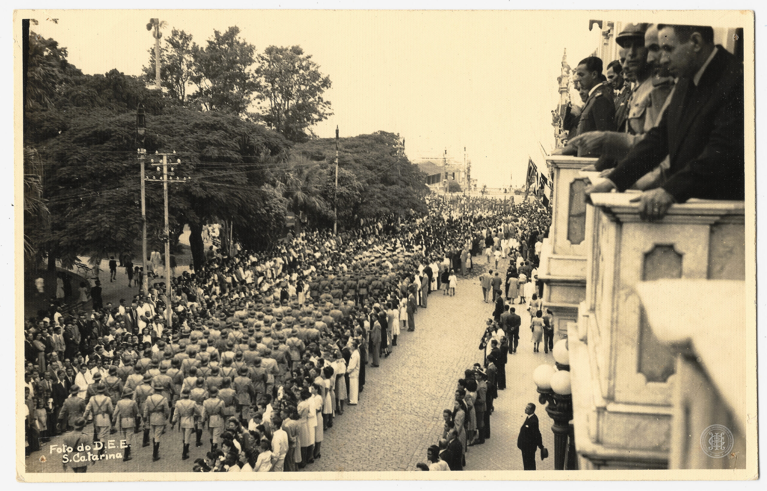 Despedida dos Expedicionários, Força Expedicionária Brasileira, FEB, Pracinhas, Desfile militar, Soldados, Farda, Palácio do Governo, Palácio Cruz e Sousa, Praça XV de Novembro, Trapiche Miramar, Centro Histórico, Florianópolis, Santa Catarina, Segunda Guerra Mundial, Nereu Ramos, Autoridades, Evento cívico, Multidão, Urbanismo, Fotojornalismo, Década de 1940